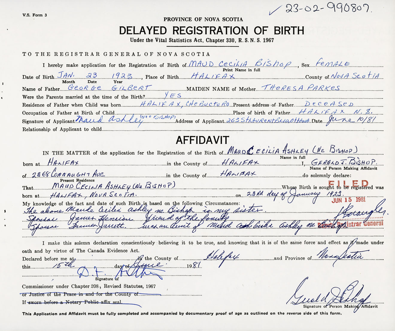 Signature of Applicant Maud Ashley Nee Bishop Address of Applicant 263 St. Laurent Blvd, Ottawa, Ontario Date 10 June 1981