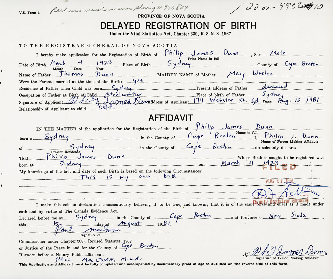 Signature of Applicant Philip James Dunn Address of Applicant 174 Webster Street, Sydney, Cape Breton Co., NS Date 15 August 1981