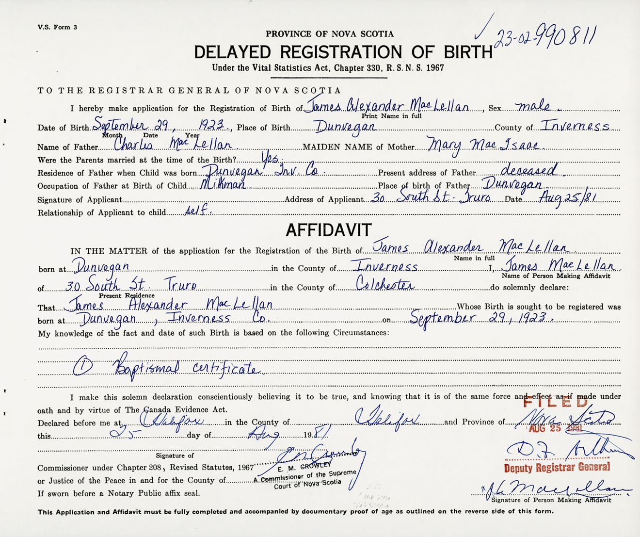 Signature of Applicant James A. MacLellan Address of Applicant 30 South Street, Truro, Colchester Co., NS Date 25 August 1981