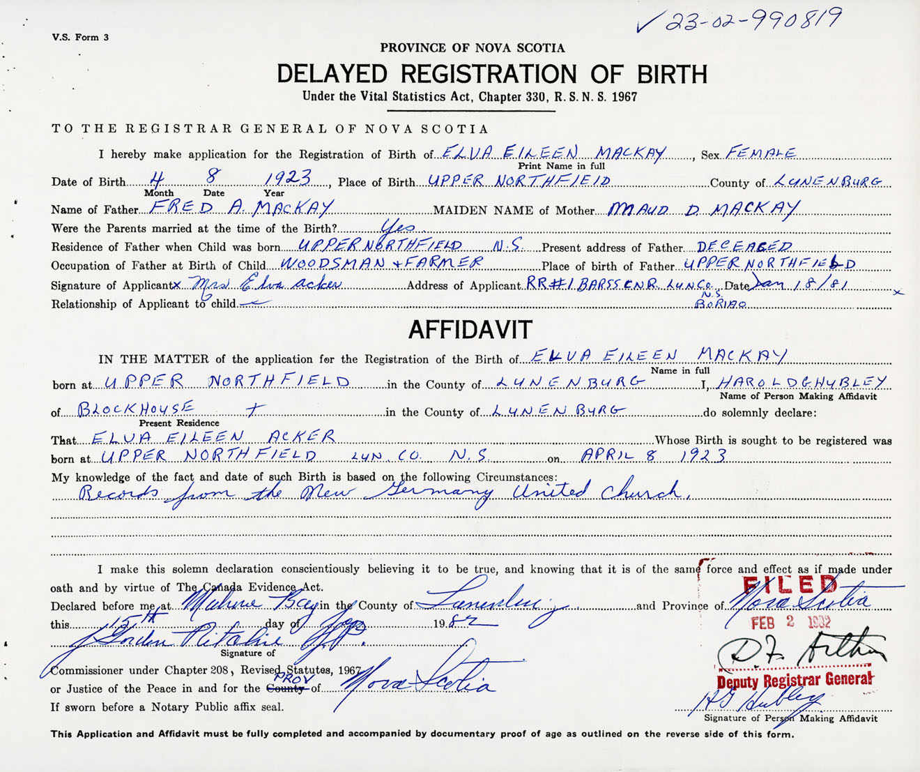 I hereby make application for the Registration of Birth of Elva EileenMackay Sex Female