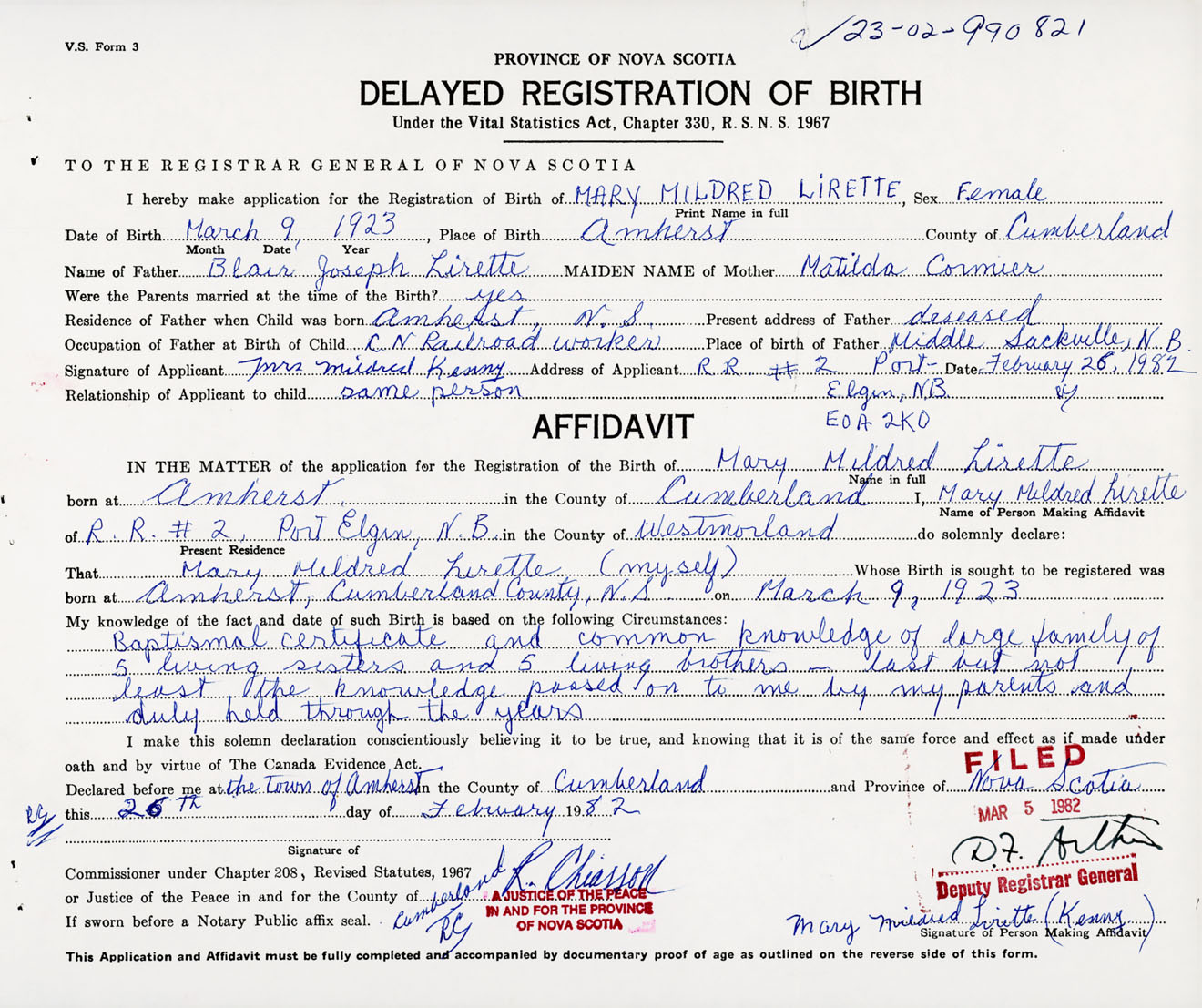 Signature of Applicant Mrs. Mildred Kenny Address of Applicant RR #2, Port Elgin, New Brunswick, E0A 2K0 Date 26 February 1982