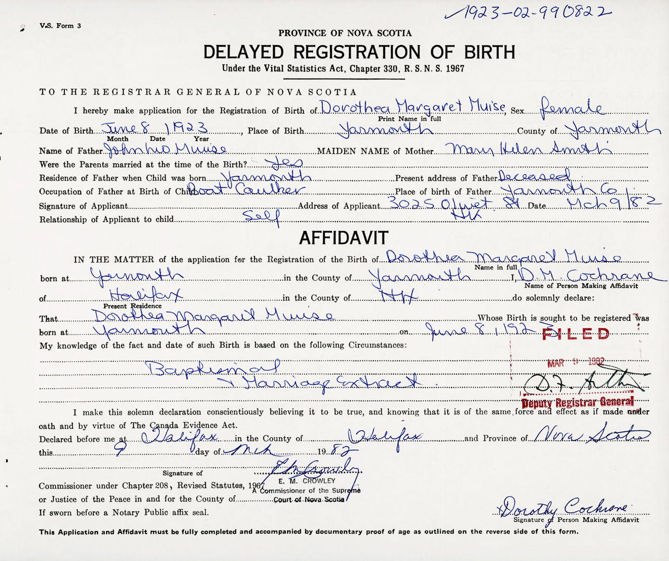 Signature of Applicant Dorothea Muise Address of Applicant 3025 Olivet Street, Halifax, NS Date 9 March 1982