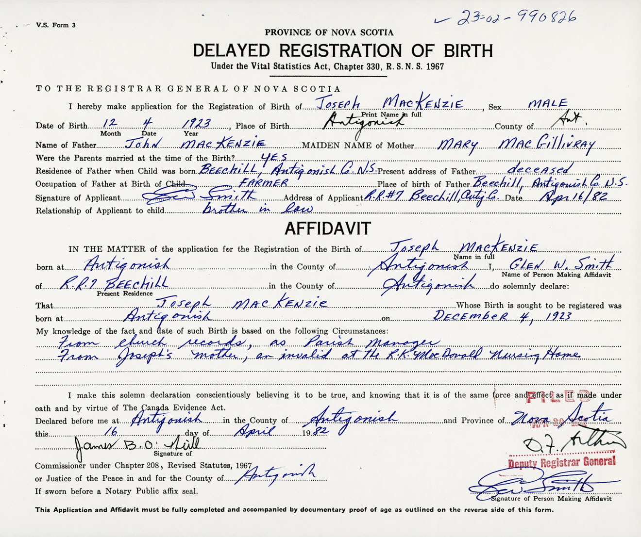 Signature of Applicant Glen W. Smith Address of Applicant RR #7, Beech Hill, Antigonish Co., NS Date 16 April 1982