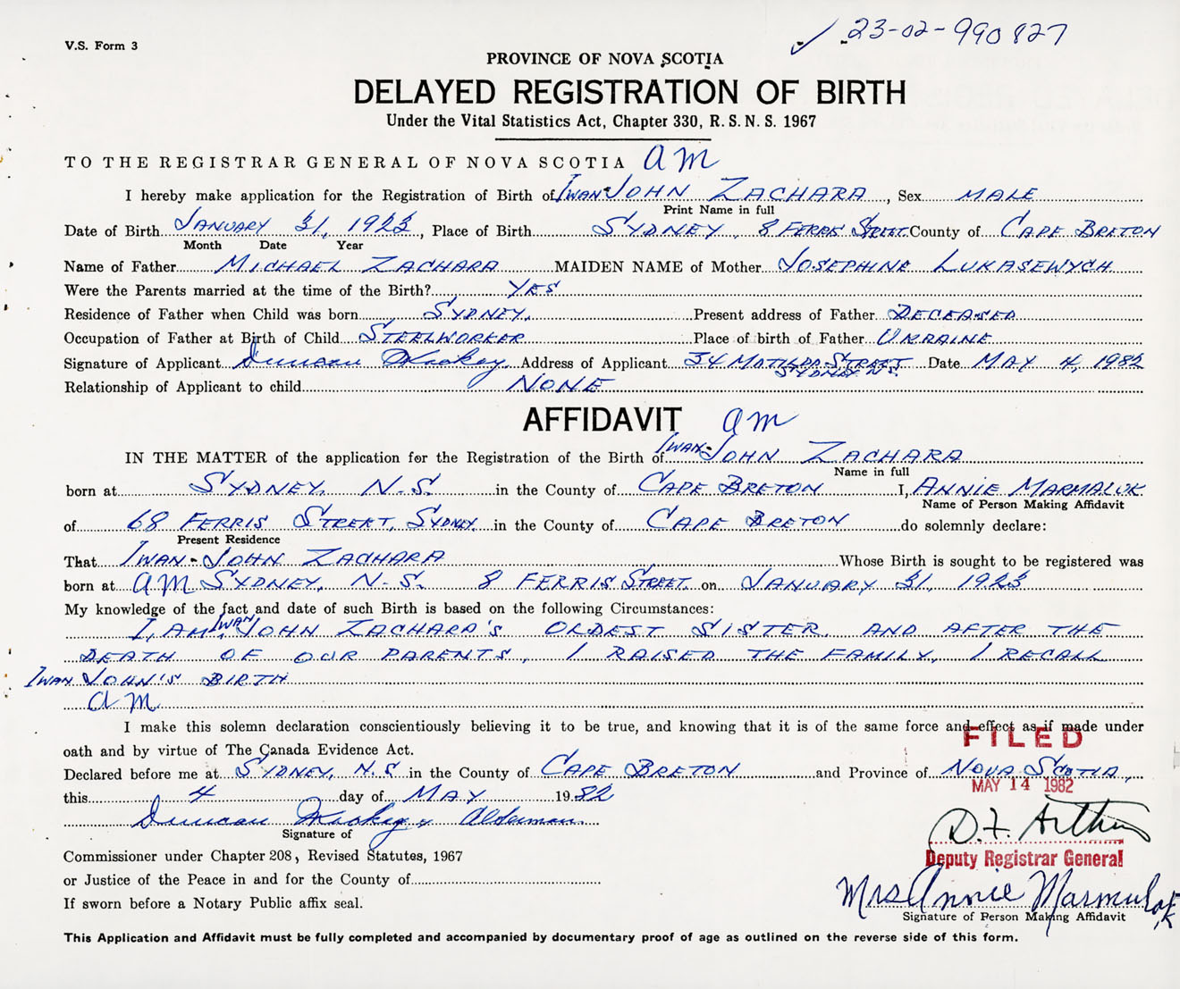Name of Father Michael Zachara MAIDEN NAME of Mother Josephine Lukasewych