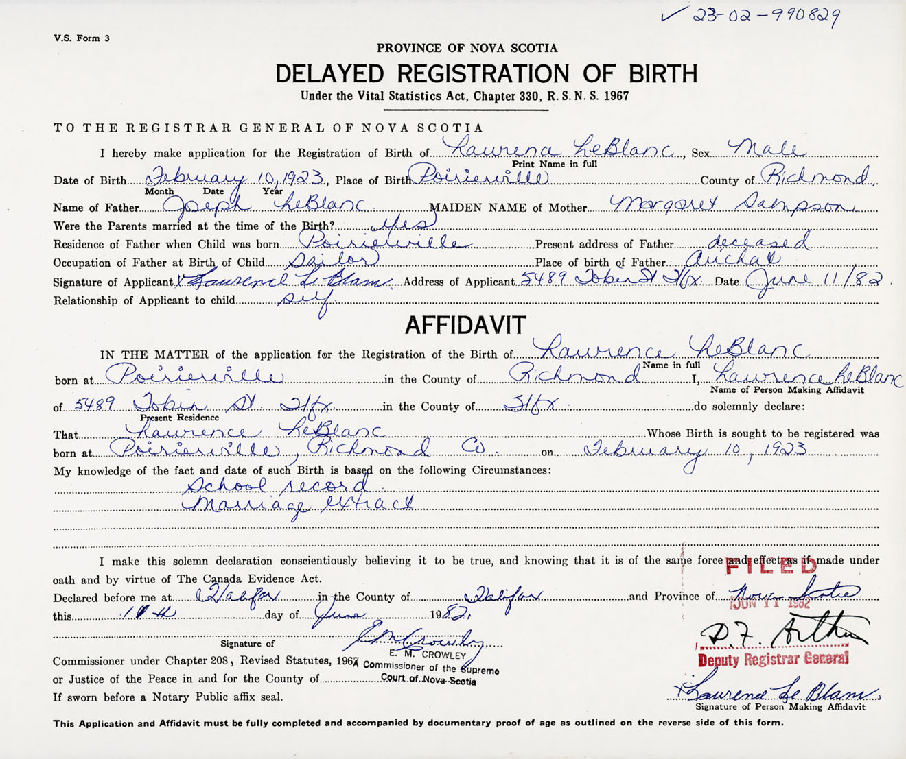 Signature of Applicant Laurence Leblanc Address of Applicant 5489 Tobin Street, Halifax, NS Date 11 June 1982