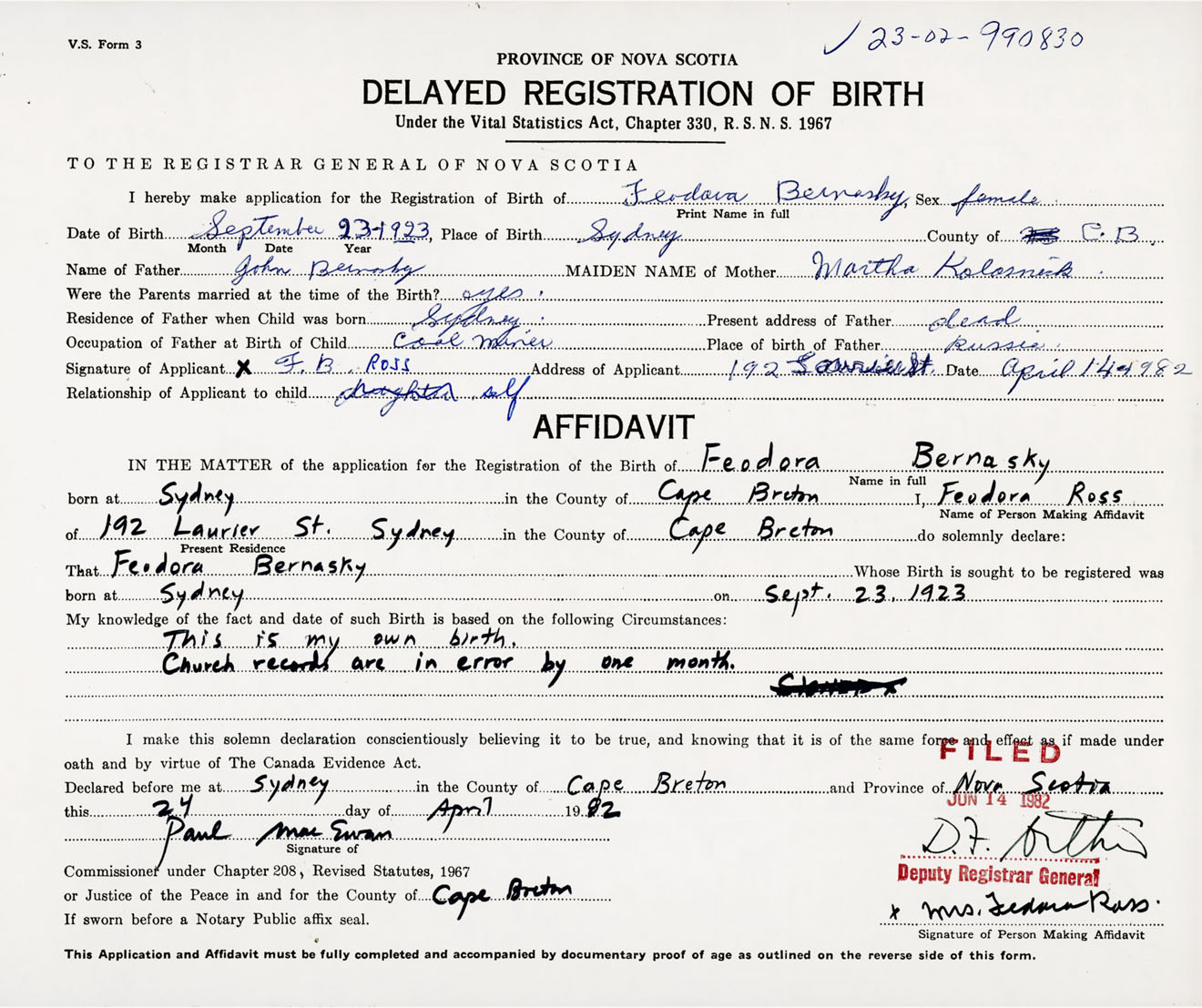 Signature of Applicant F. B. Ross Address of Applicant 192 Laurier Street, Sydney, Cape Breton Co., NS Date 14 April 1982