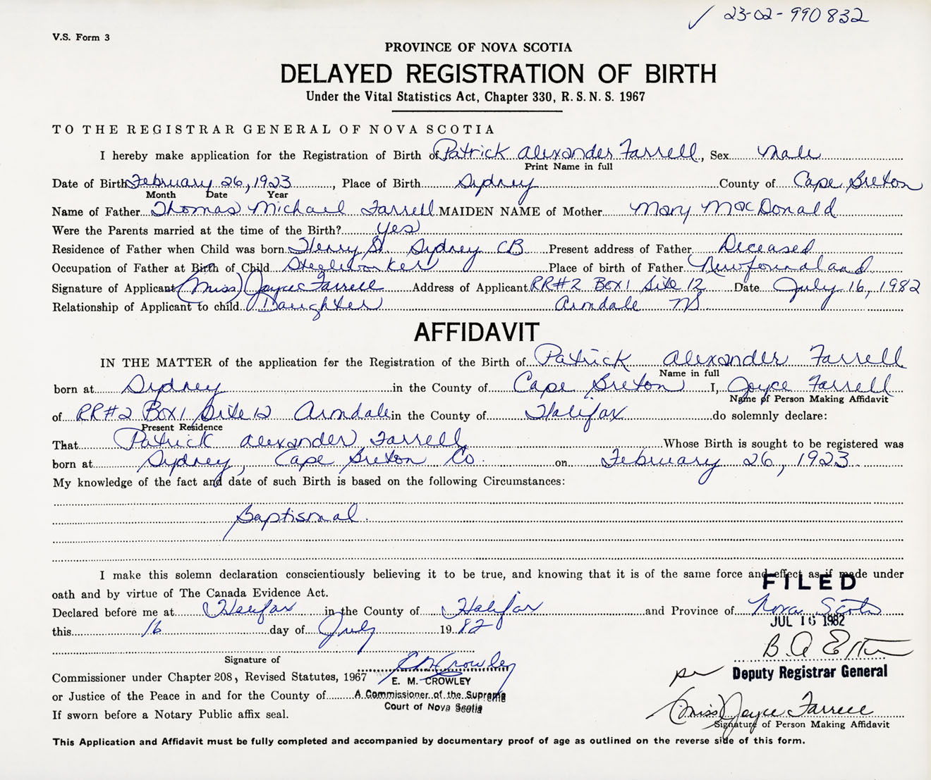 Date of Birth February 26, 1923 Place of Birth SydneyCounty of Cape Breton