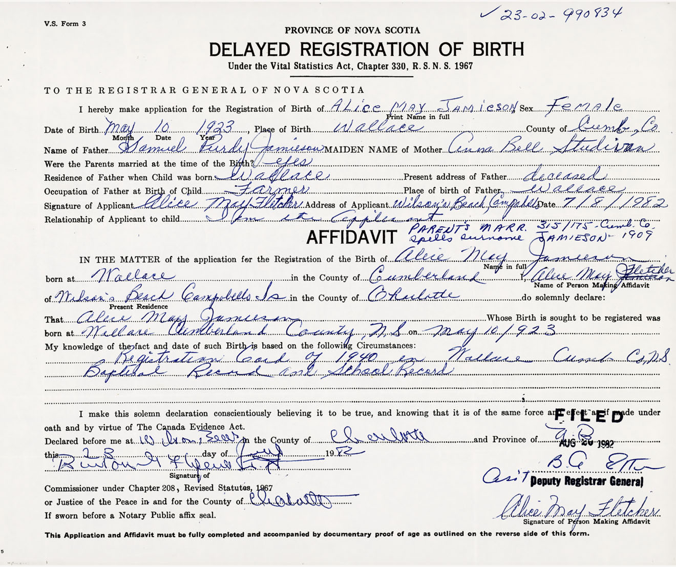 Signature of Applicant Alice M. Fletcher Address of Applicant Wilson's Beach, Campobello Island, New Brunswick Date 7 August 1982