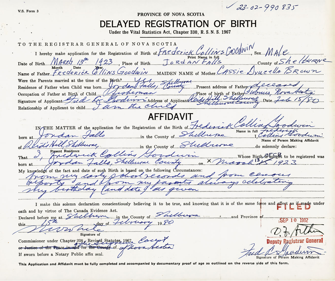 Signature of Applicant Fred C. Goodwin Address of Applicant Reids Hill, Shelburne, NS Date 15 February 1980