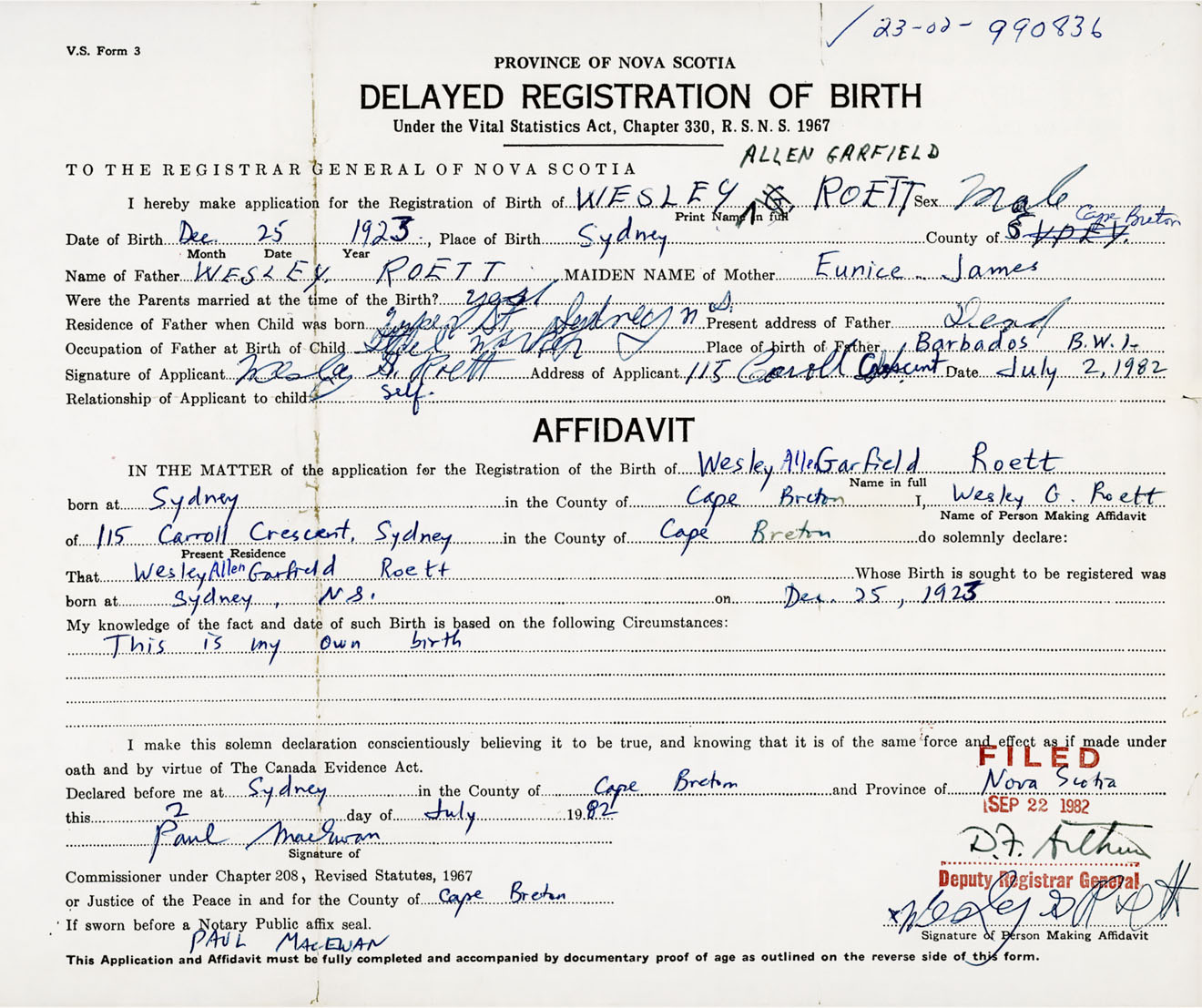 I hereby make application for the Registration of Birth of Wesley Allen GarfieldRoett Sex Male