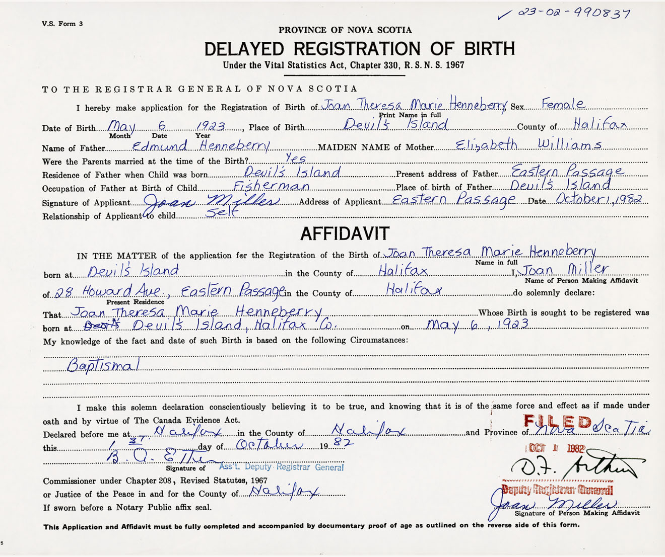 Signature of Applicant Joan Miller Address of Applicant Eastern Passage, Halifax Co., NS Date 1 October 1982
