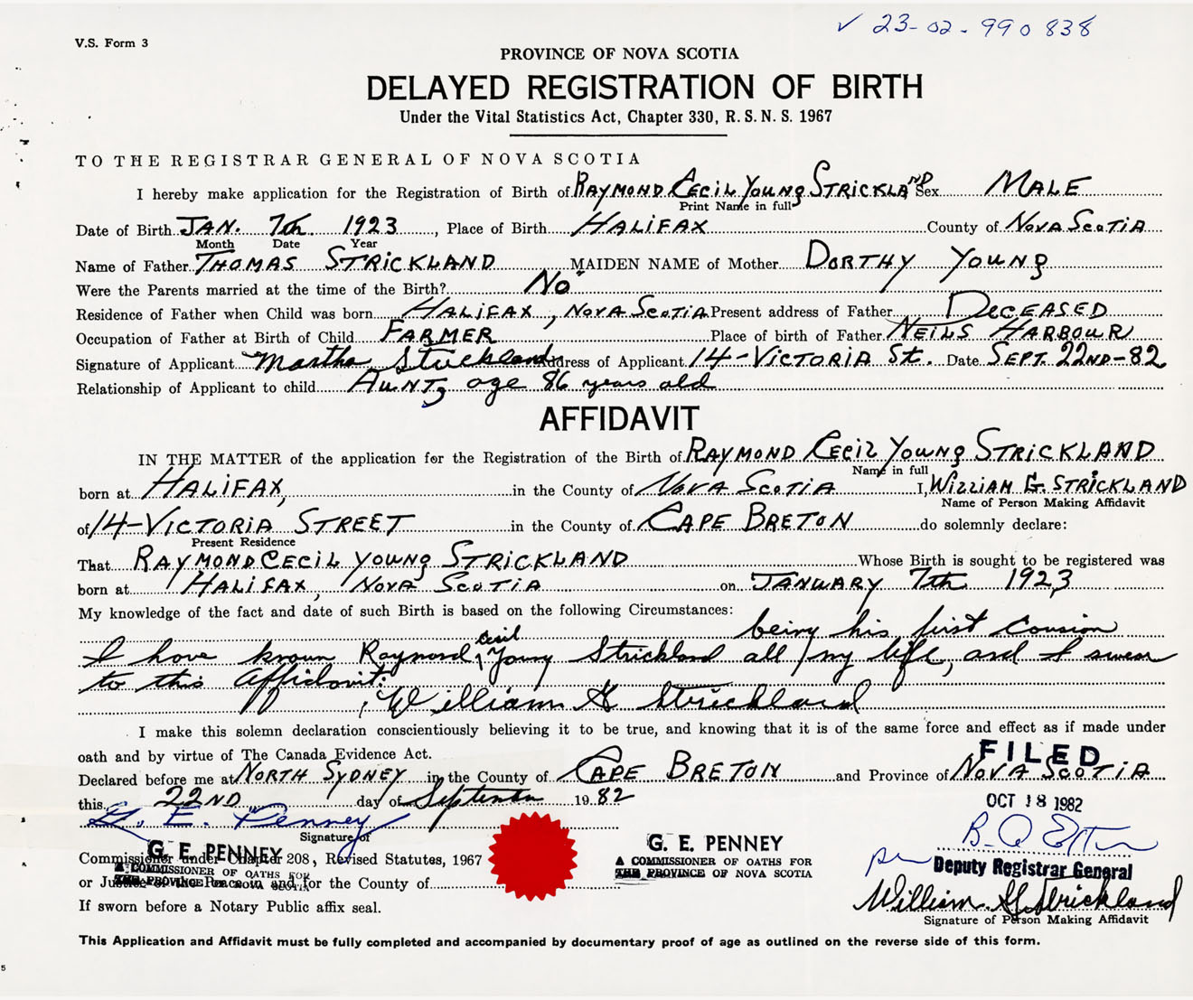 Being his first cousin, I have known Raymond Cecil Young Strickland all my life and I swear to this affidavit.