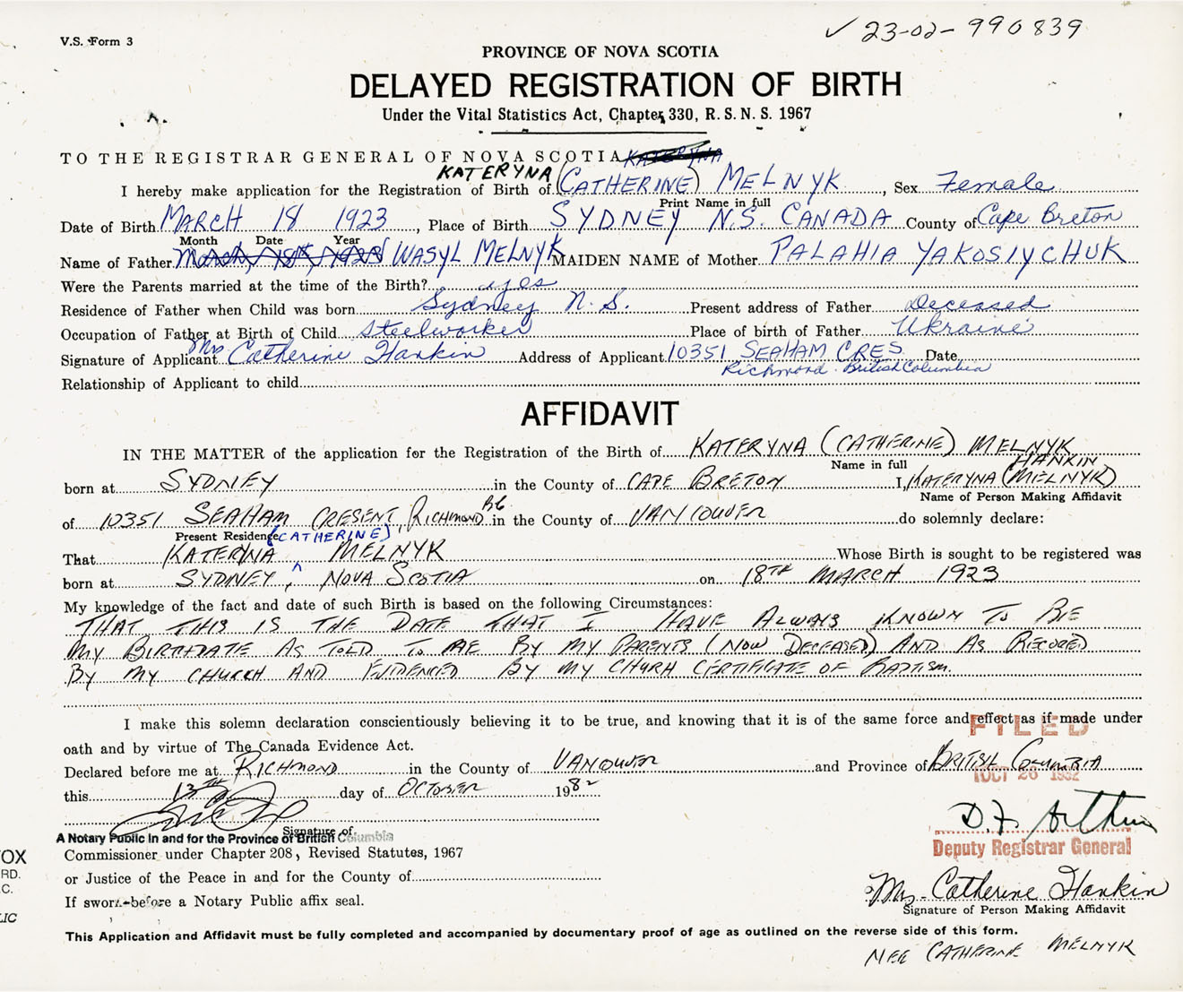 I hereby make application for the Registration of Birth of Kateryna (Catherine)Melnyk Sex Female