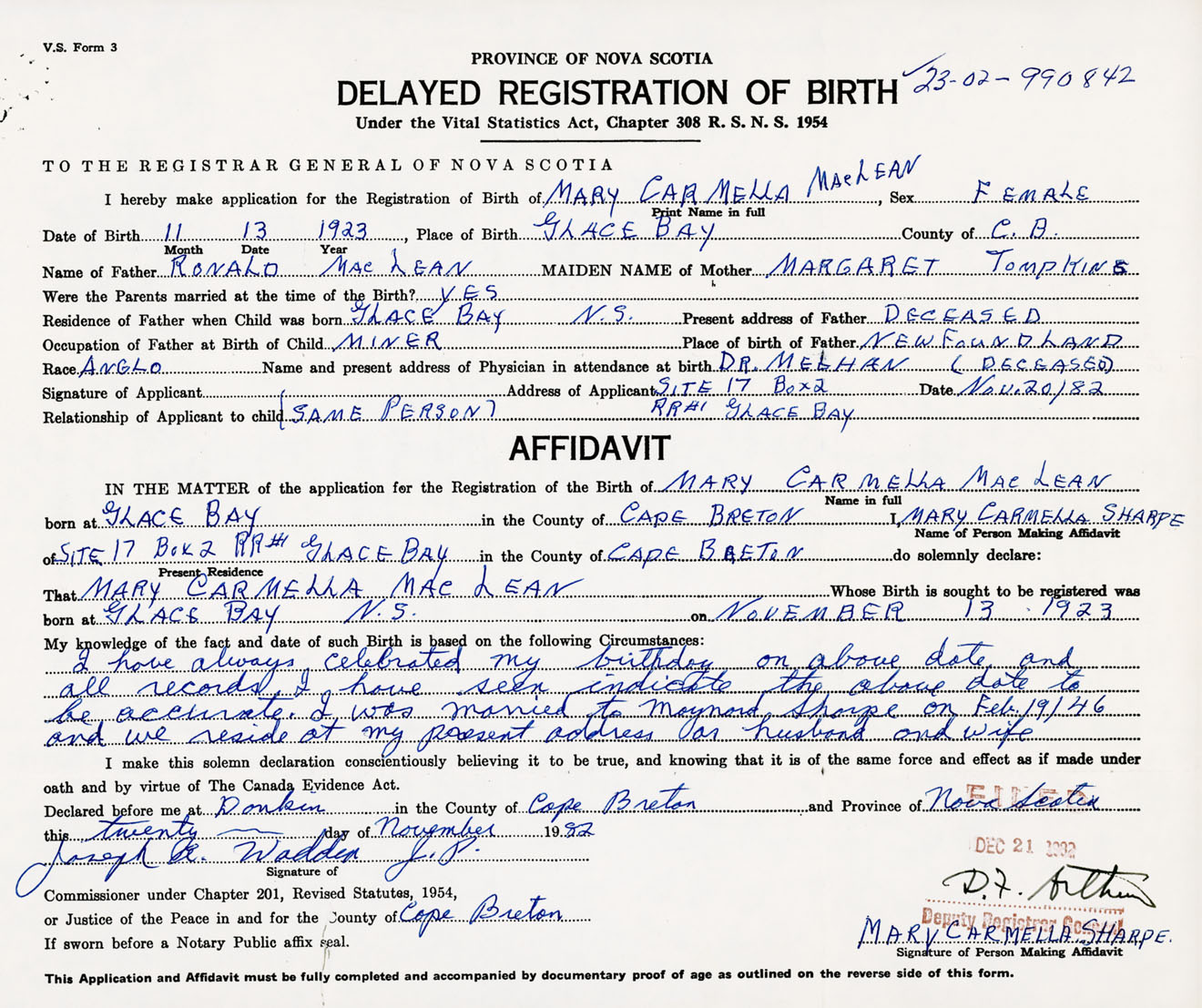 I hereby make application for the Registration of Birth of Mary CarmellaMacLean Sex Female