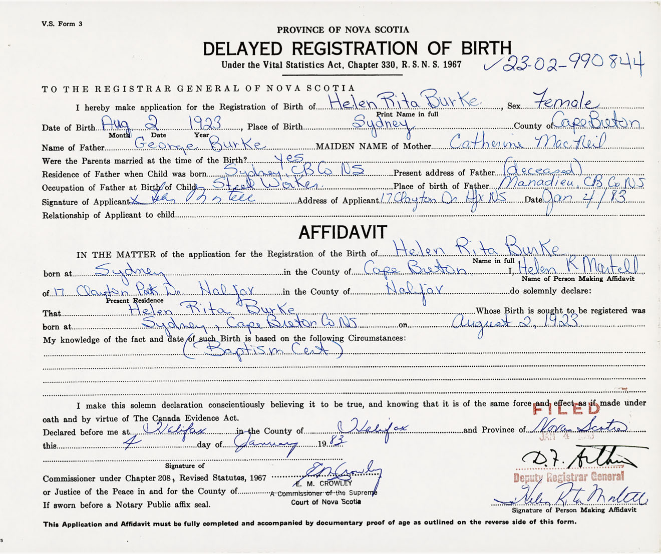 IN THE MATTER of the application for the Registration of the Birth of Helen RitaBurke
