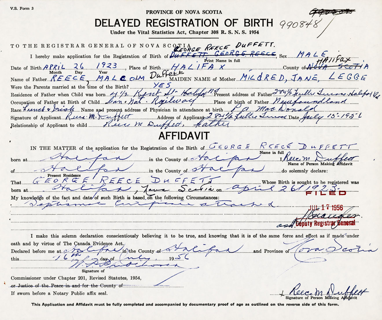 Signature of Applicant Reece M. Duffett Address of Applicant 284 1/2 Fuller Terrace, Halifax, NS Date 15 July 1956