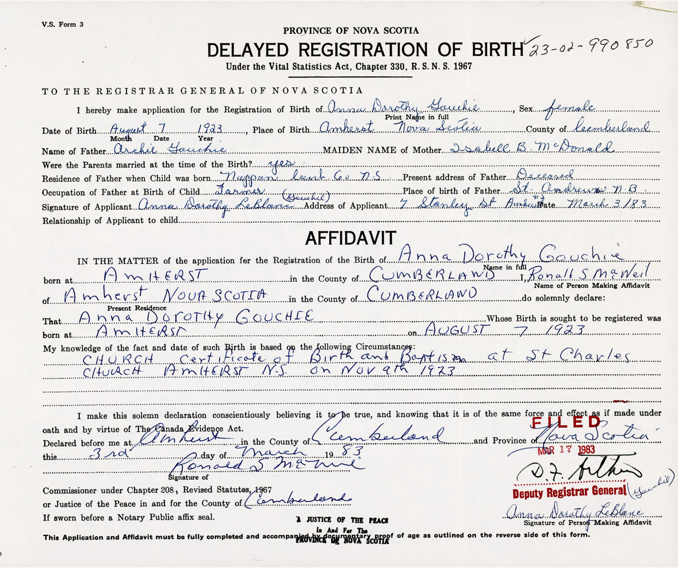 Signature of Applicant Anna Dorothy Leblanc Gouchie Address of Applicant 7 Stanley Street, Amherst, Cumberland Co., NS Date 3 March 1983