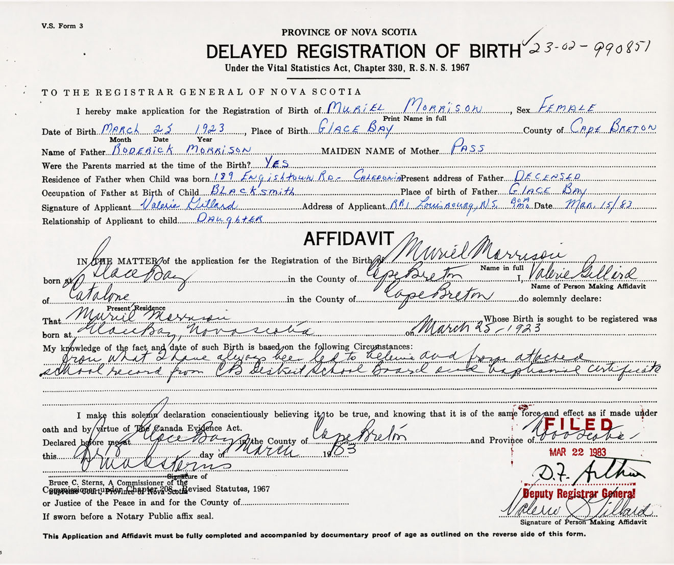 Date of Birth March 25, 1923 Place of Birth Glace BayCounty of Cape Breton