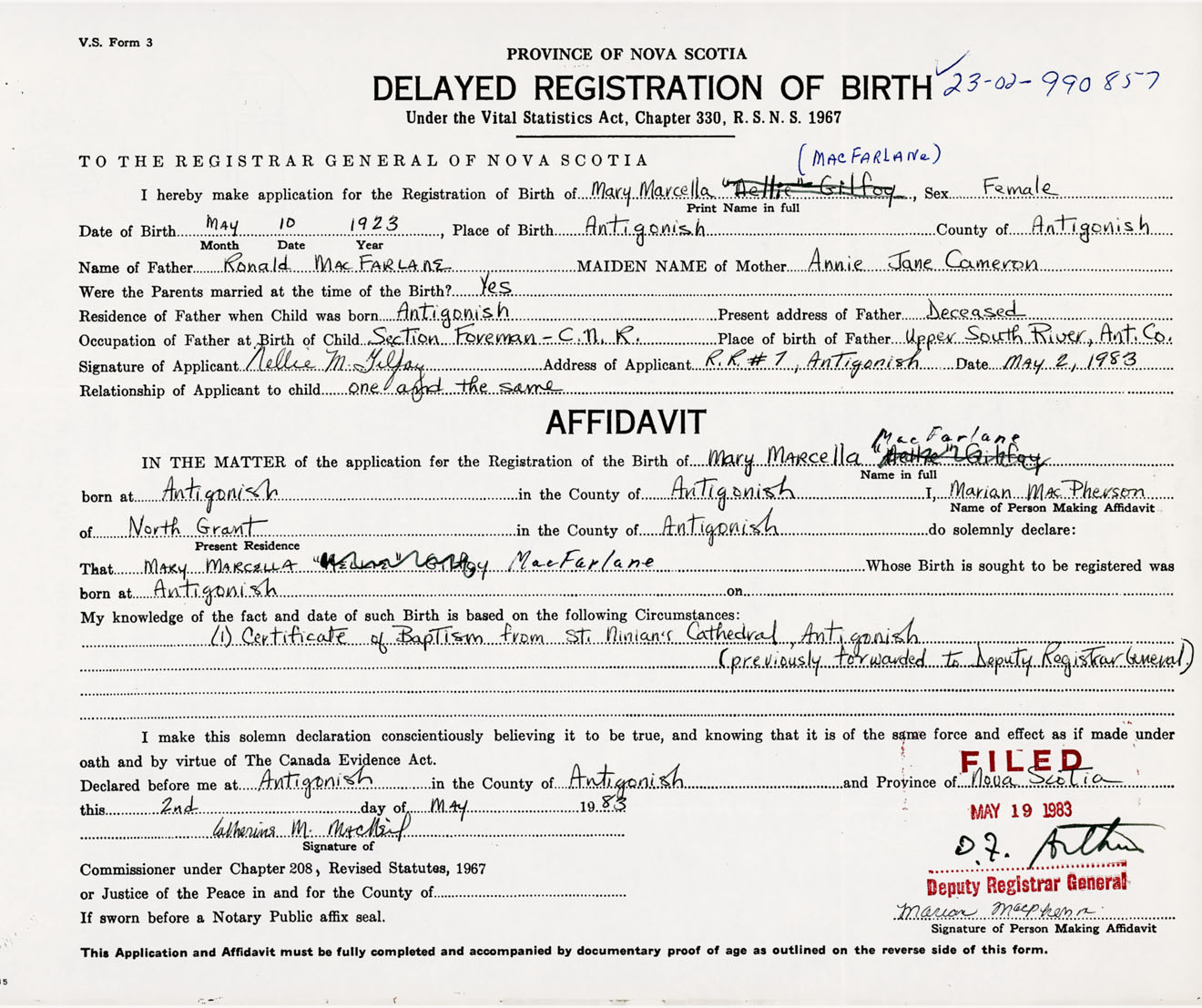 Date of Birth May 10, 1923 Place of Birth AntigonishCounty of Antigonish