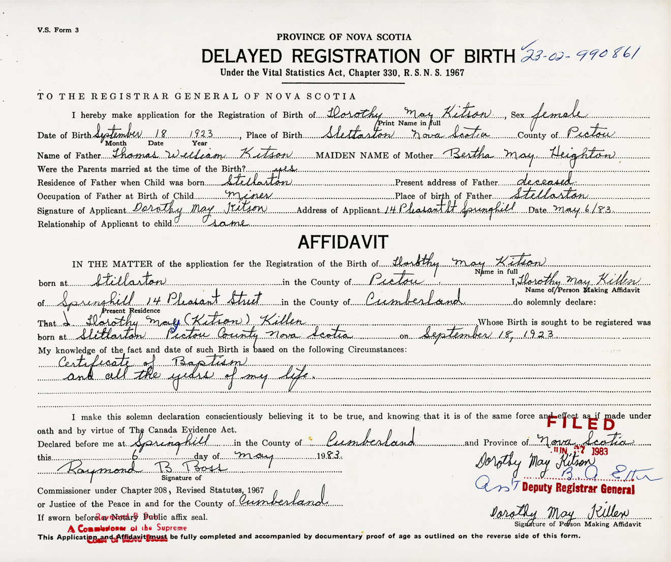 Signature of Applicant Dorothy May Kitson Address of Applicant 14 Pleasant Street, Springhill, Cumberland Co., NS Date 6 May 1983