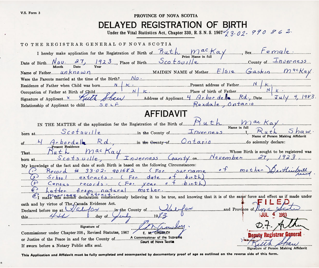 Signature of Applicant Ruth Shaw Address of Applicant 4 Arbordelle Road, Rexdale, Ontario Date 4 July 1983