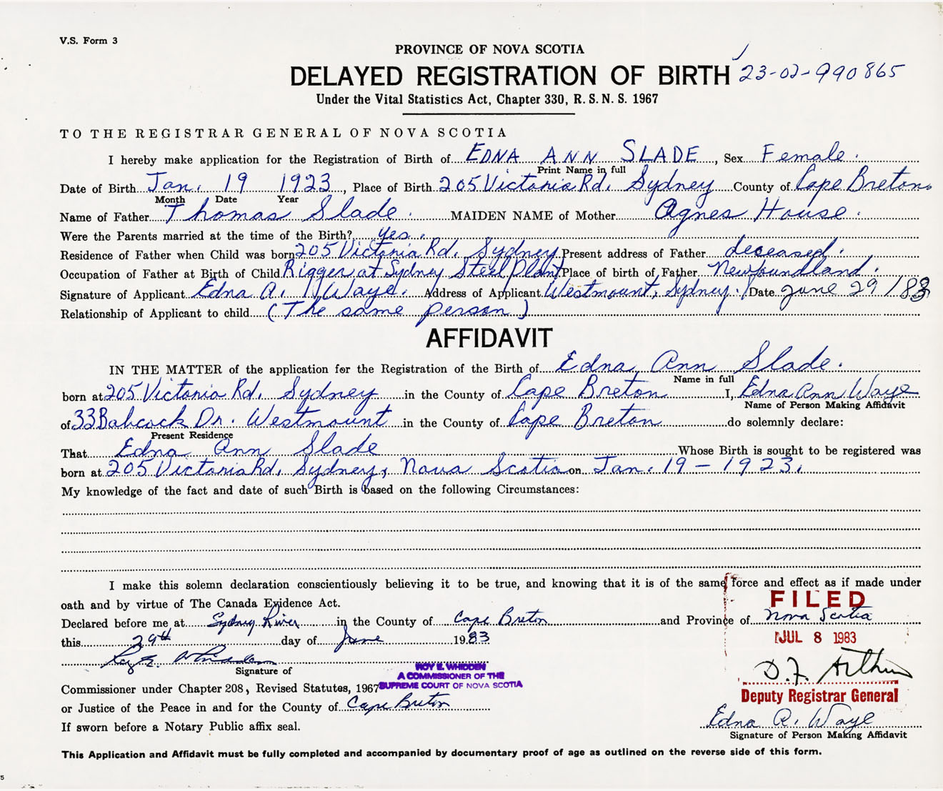 Signature of Applicant Edna A. Waye Address of Applicant Westmount, Sydney, Cape Breton Co., NS Date 29 June 1983