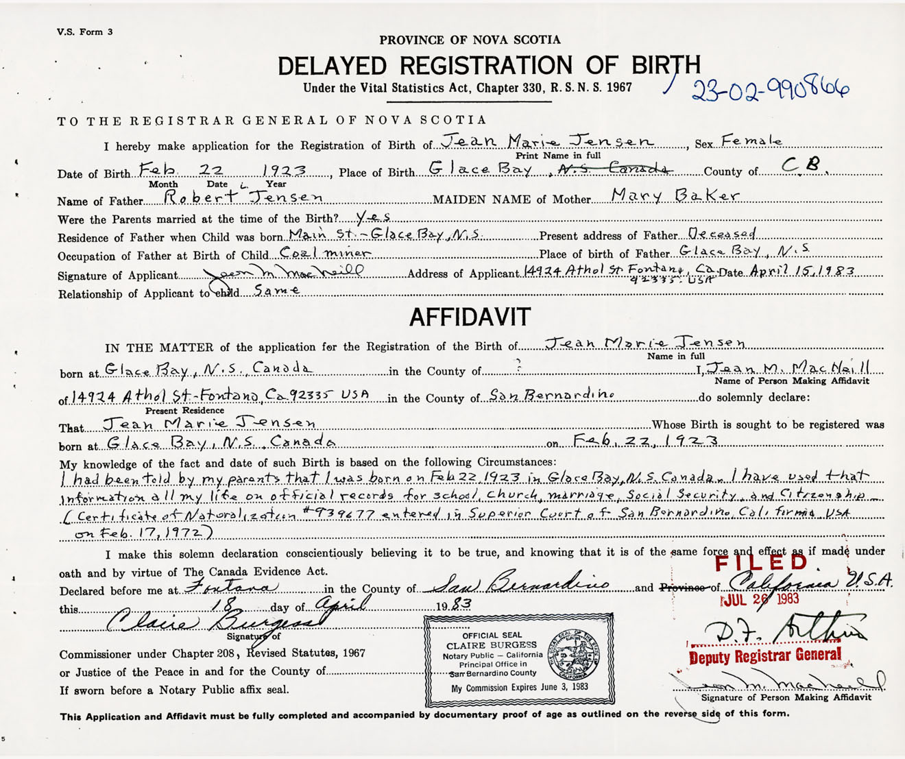 I had been told by my parents that I was born on February 22, 1923 in Glace Bay, NS, Canada. I have used that information all my life on official records for school, church, marriage, social security and citizenship (certificate of Naturalization #939677 entered in Superior court of San Bernardino, California, USA on February 17, 1972)