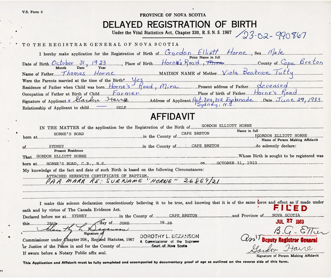 Date of Birth October 31, 1923 Place of Birth Hornes Road, MiraCounty of Cape Breton