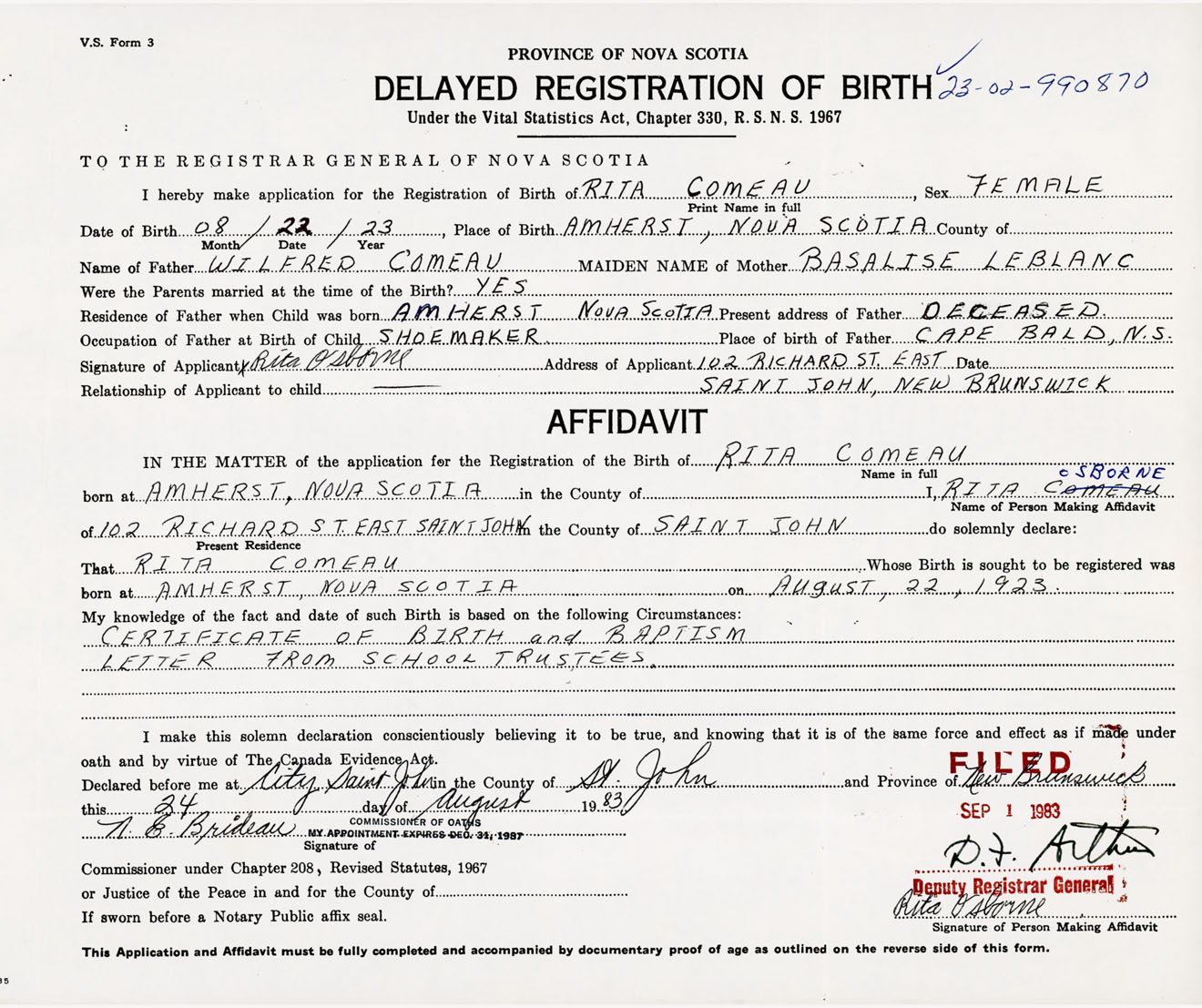 Signature of Applicant Rita Osborne Address of Applicant 102 Richard Street East, Saint John, New Brunswick Date August 1983
