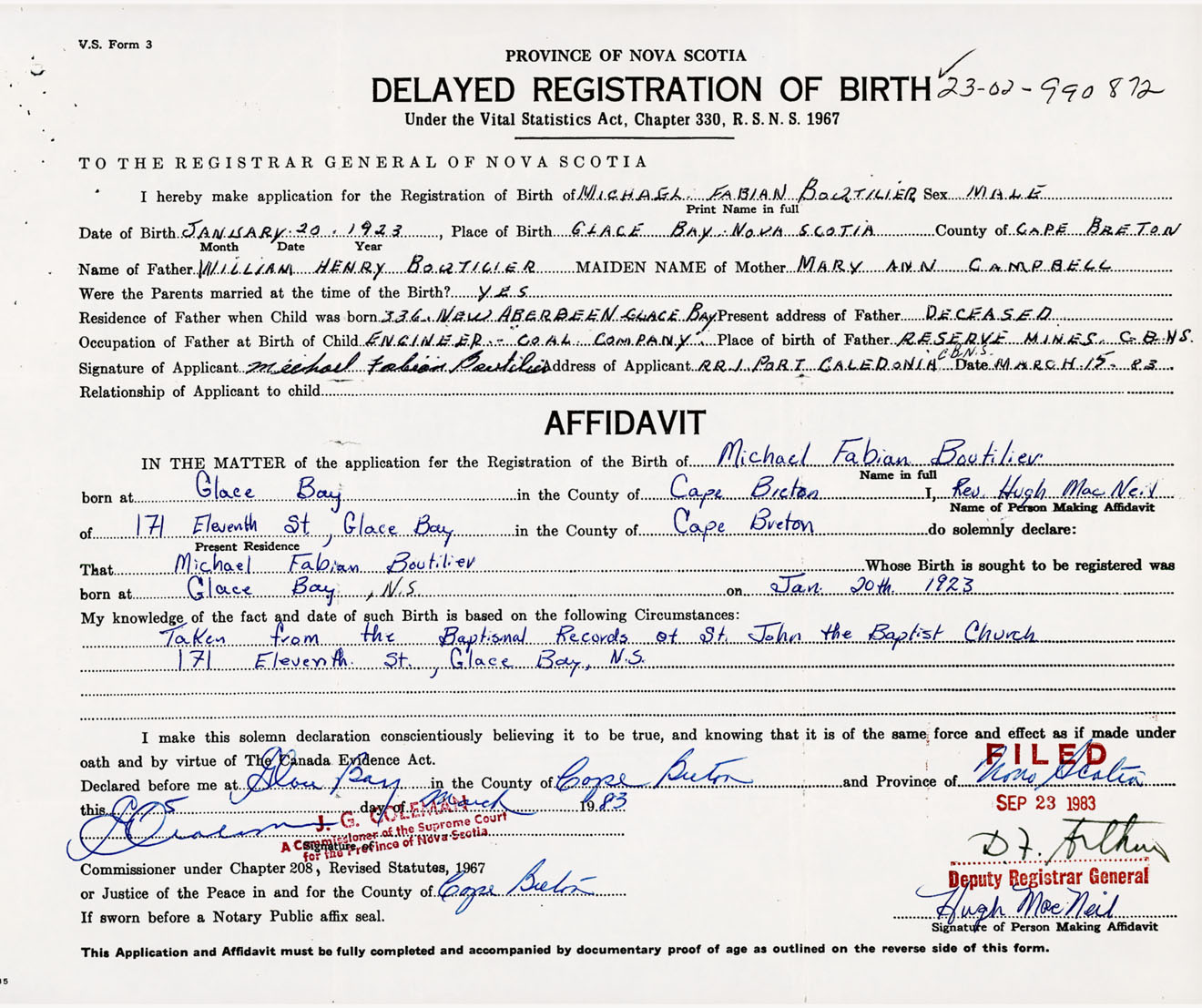 I hereby make application for the Registration of Birth of Michael FabianBoutilieer Sex Male