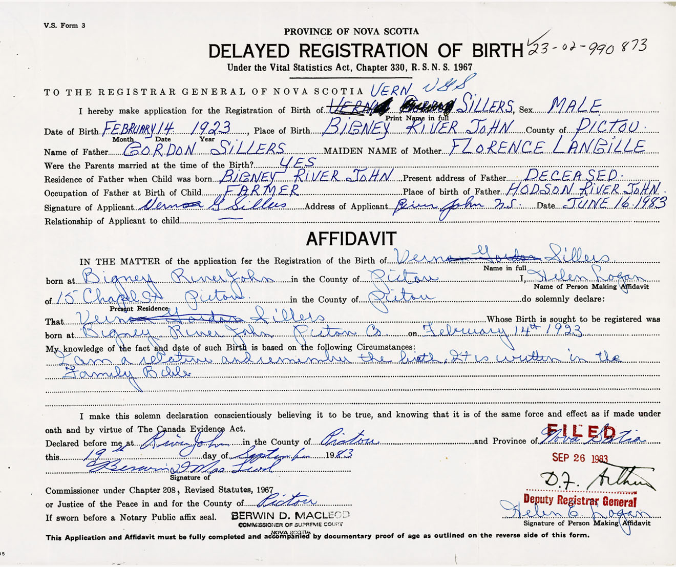 Signature of Applicant Vernon G. Sillers Address of Applicant River John, Pictou Co., NS Date 16 June 1983