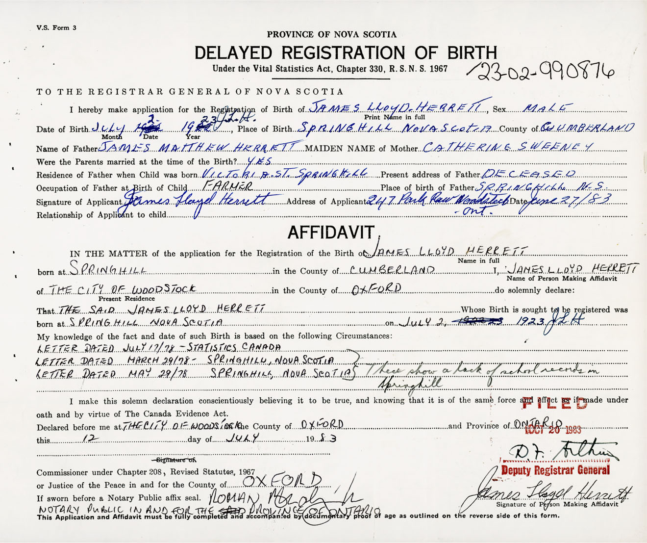Signature of Applicant James Lloyd Herrett Address of Applicant 247 Park Row, Woodstock, Ontario Date 27 June 1983