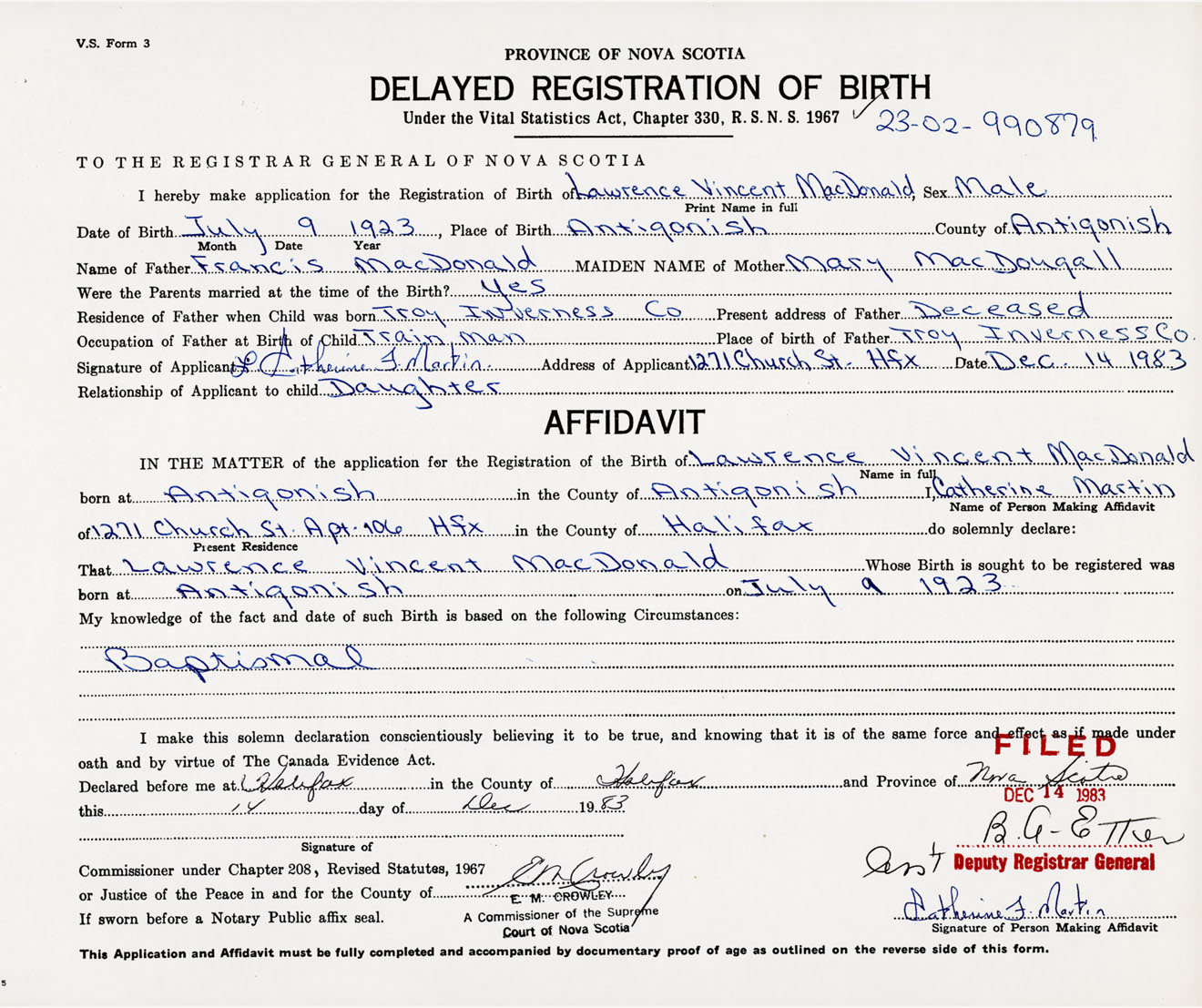 Signature of Applicant Catherine F. Martin Address of Applicant 1271 Church Street, Halifax, NS Date 14 December 1983