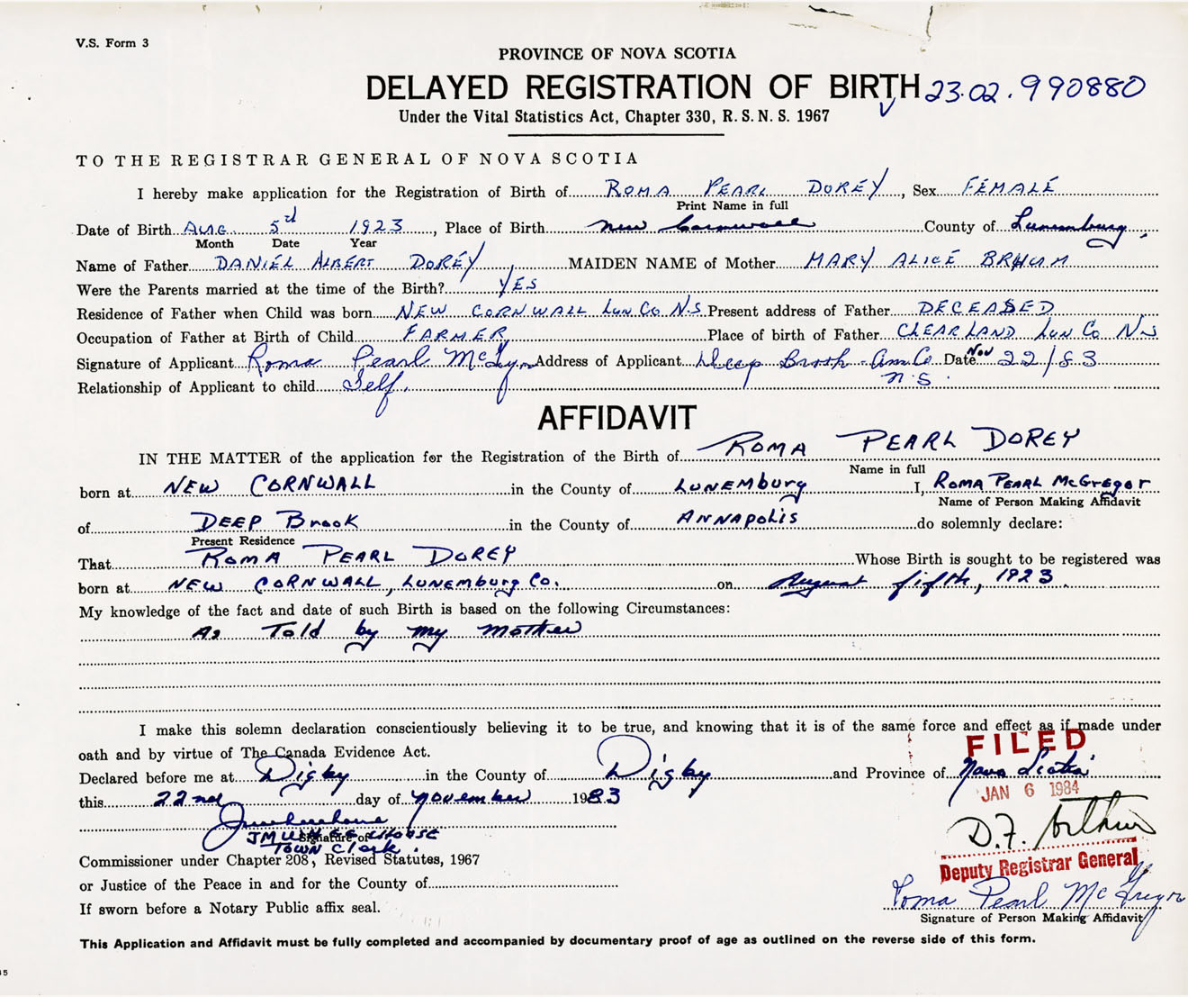 Signature of Applicant Roma Pearl McGregor Address of Applicant Deep Brook, Annapolis Co., NS Date 11 November 1983