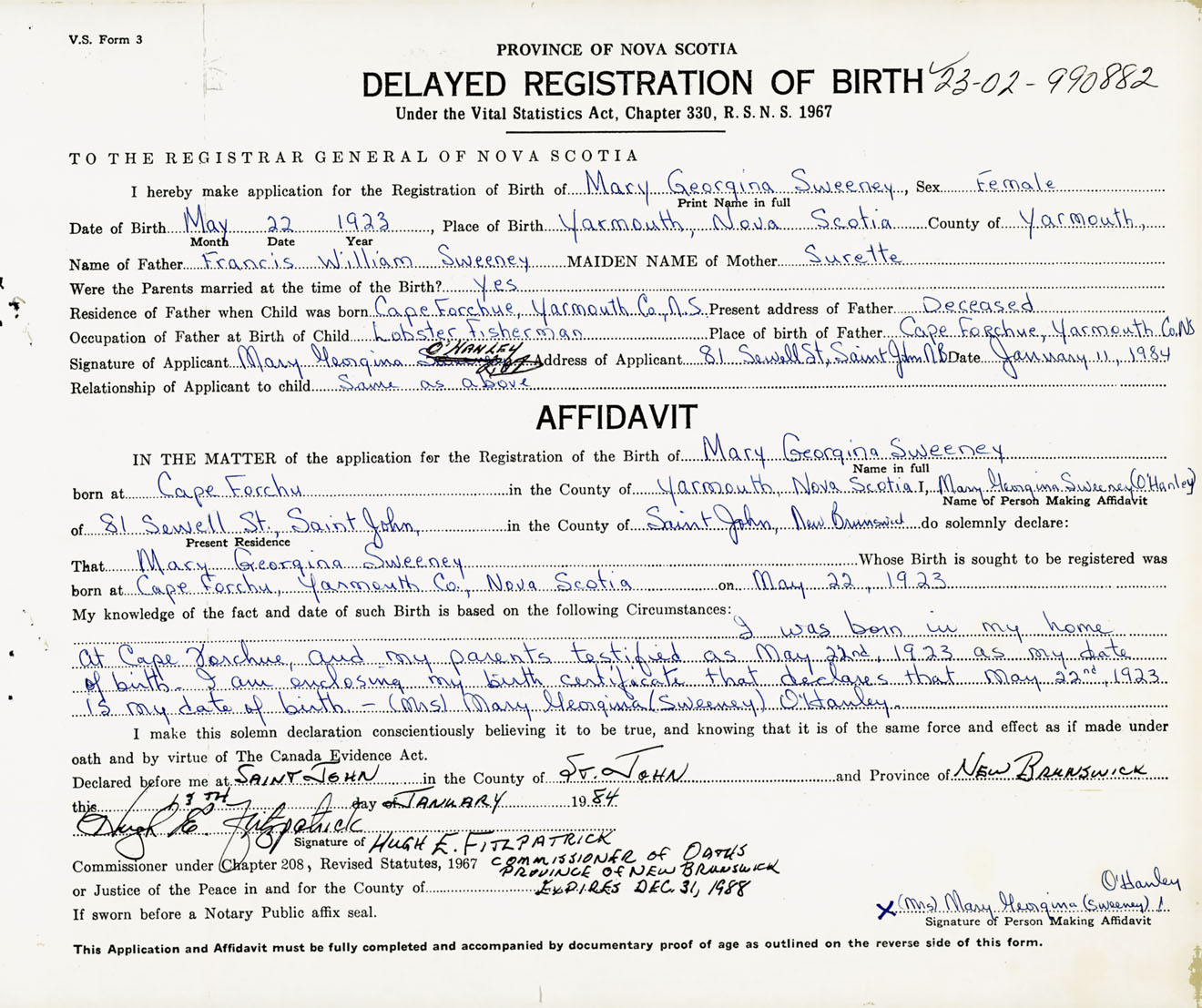 I was born in my home at Cape Forchu and my parents testified as May 22nd, 1923 as my date of birth. I am enclosing my birth certificate that declares that May 22nd, 1923 is my date of birth - Mrs. Mary Georgina (Sweeney) O'Hanley
