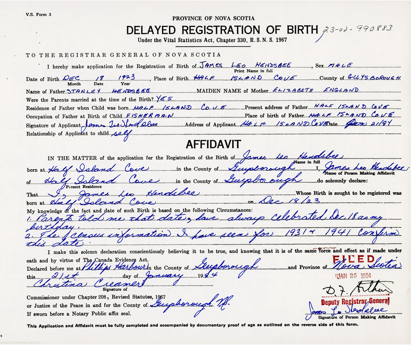 Signature of Applicant James Leo Hendsbee Address of Applicant Half Island Cove, Guysborough Co., NS Date 21 January 1984