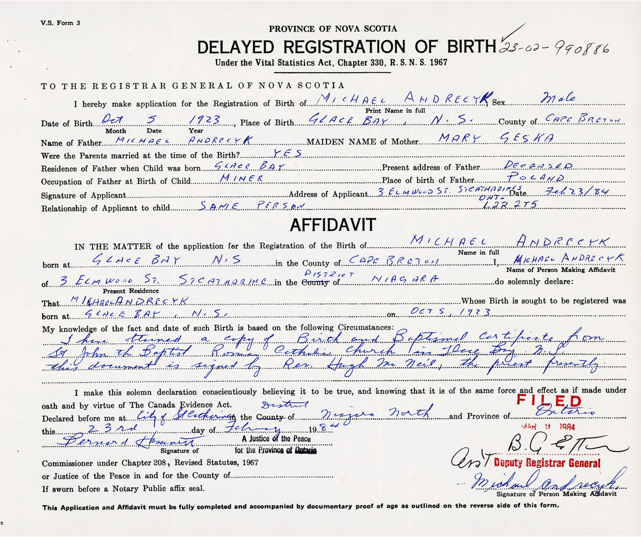 I hereby make application for the Registration of Birth of MichaelAndrecyk Sex Male
