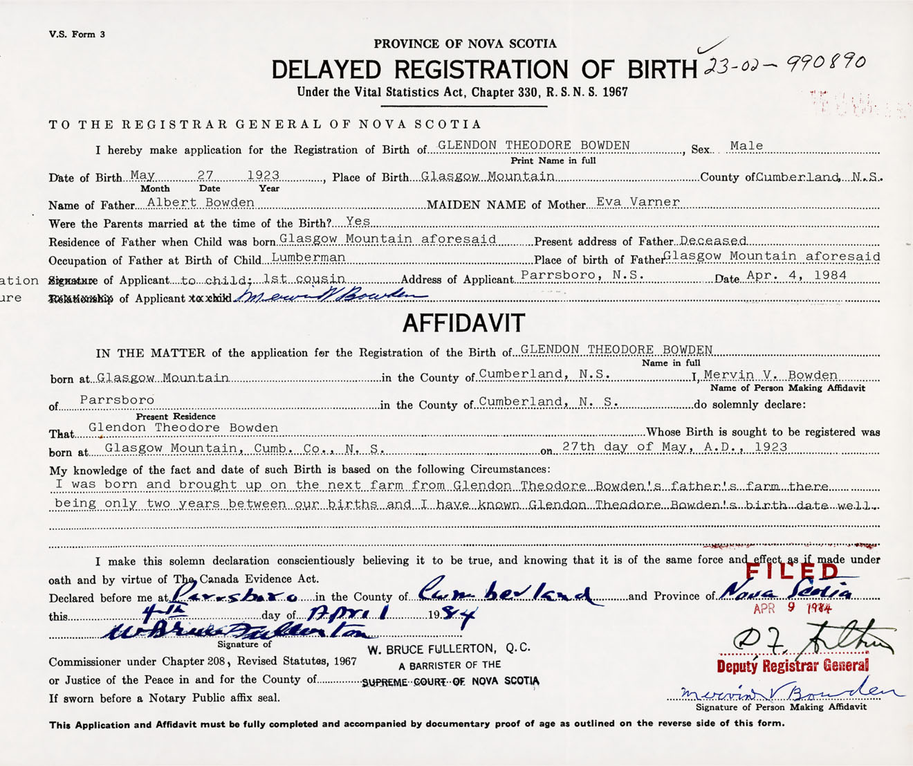 I was born and brought up on the next farm from Glendon Theodore Bowden's father's farm there being only two years between our births and I have known Glendon Theodore Bowden's birth date well.