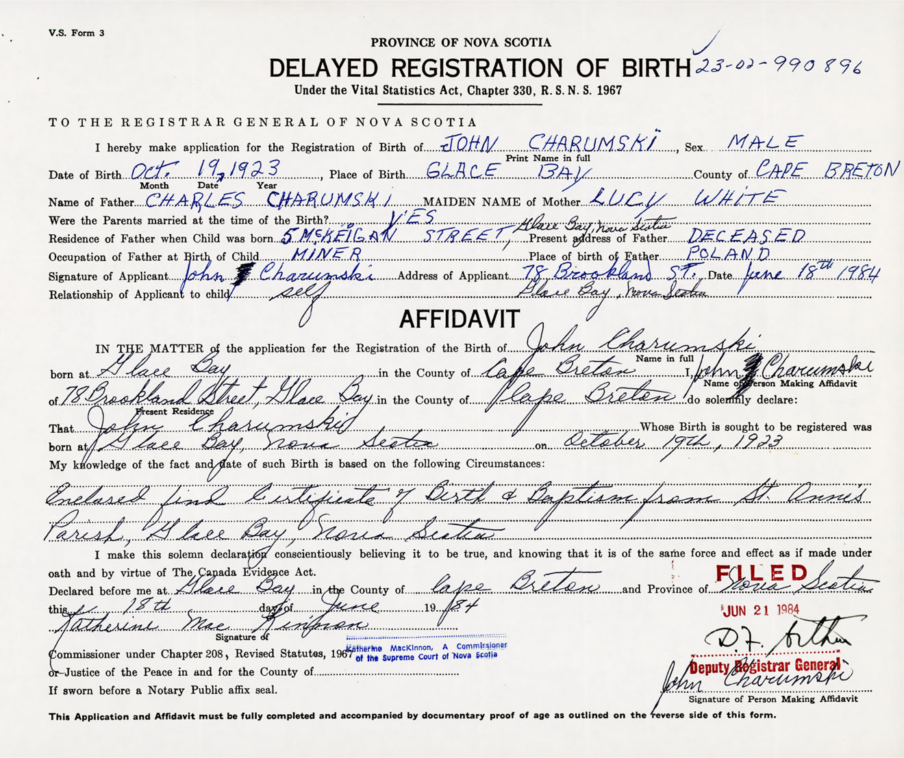 Signature of Applicant John Charumski Address of Applicant 78 Brookland Street, Glace Bay, Cape Breton Co., NS Date 18 June 1984