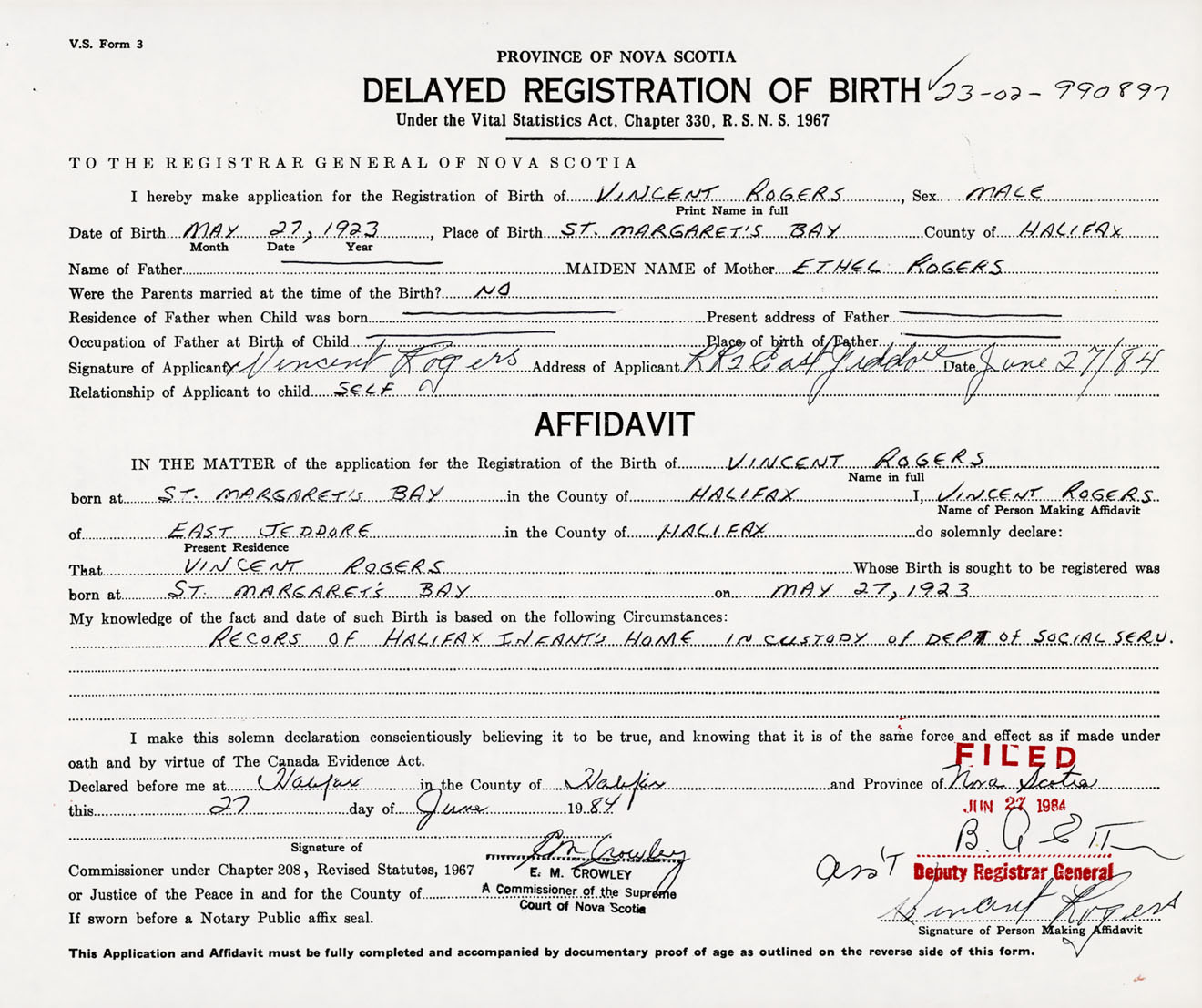 I hereby make application for the Registration of Birth of VincentRogers Sex Male