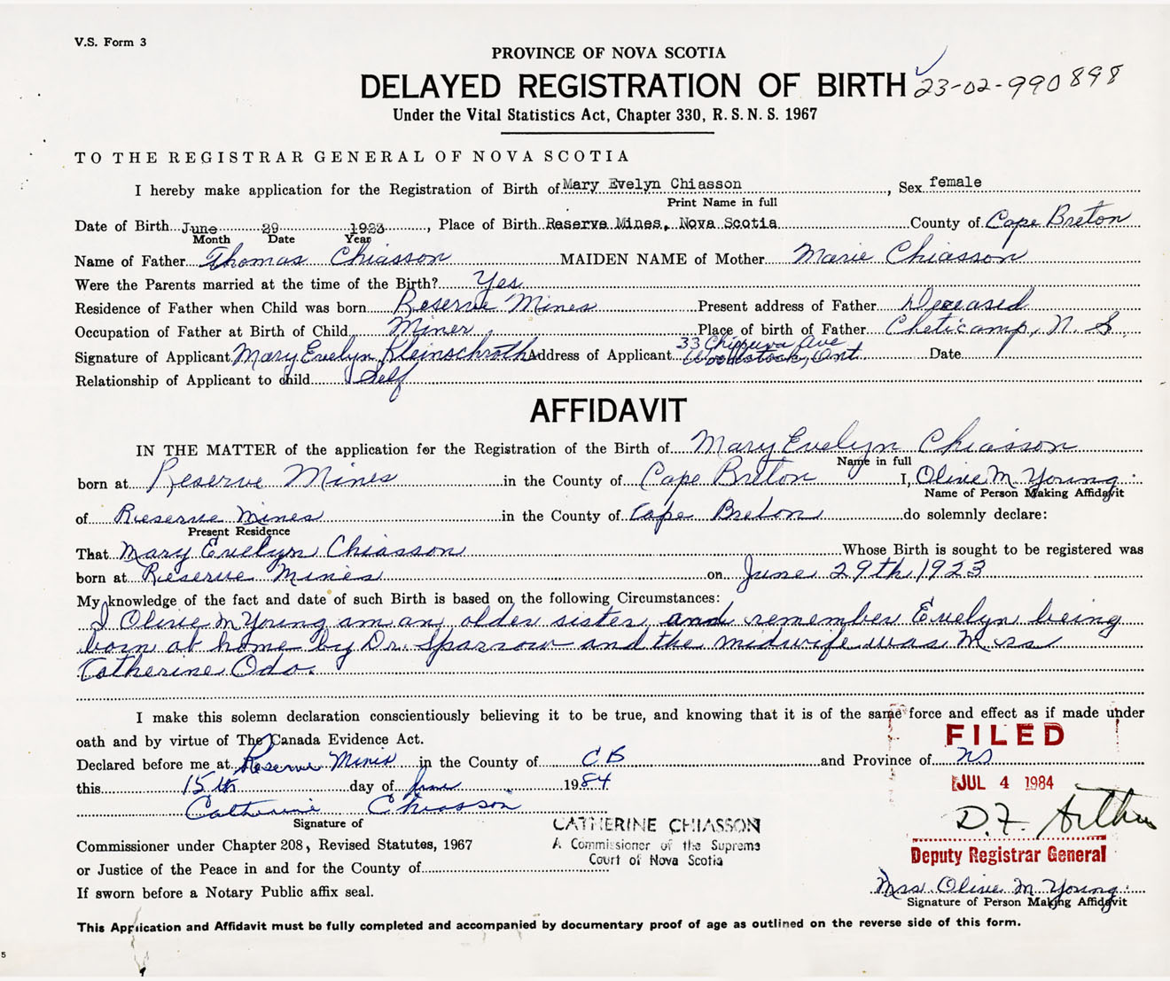 I hereby make application for the Registration of Birth of Mary EvelynChiasson Sex Female