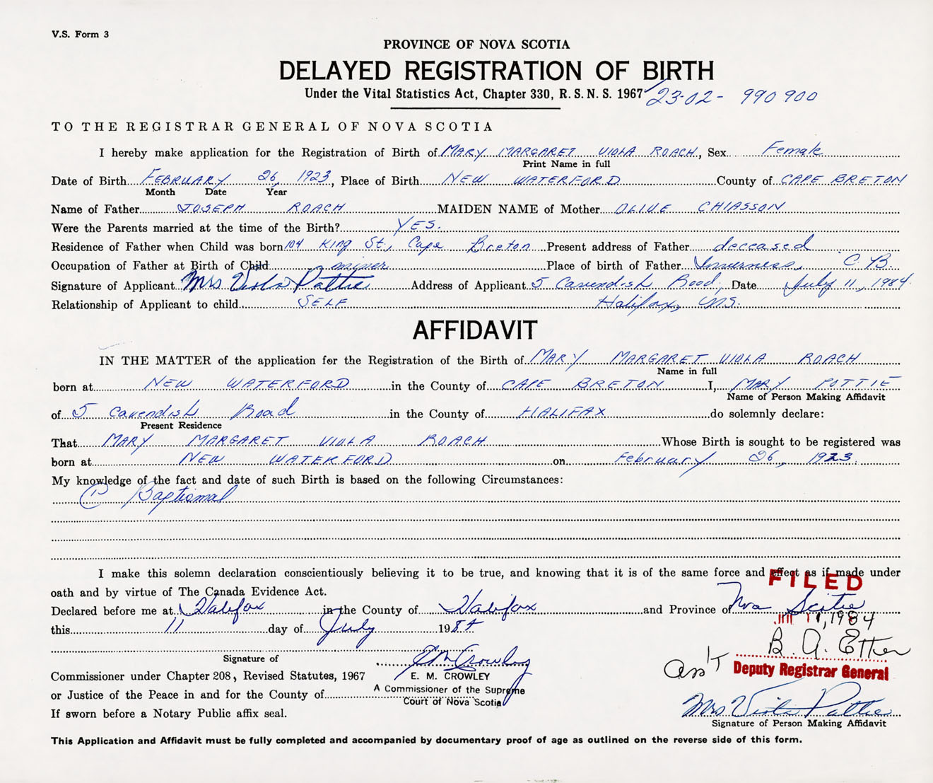 I hereby make application for the Registration of Birth of Mary Margaret ViolaRoach Sex Female