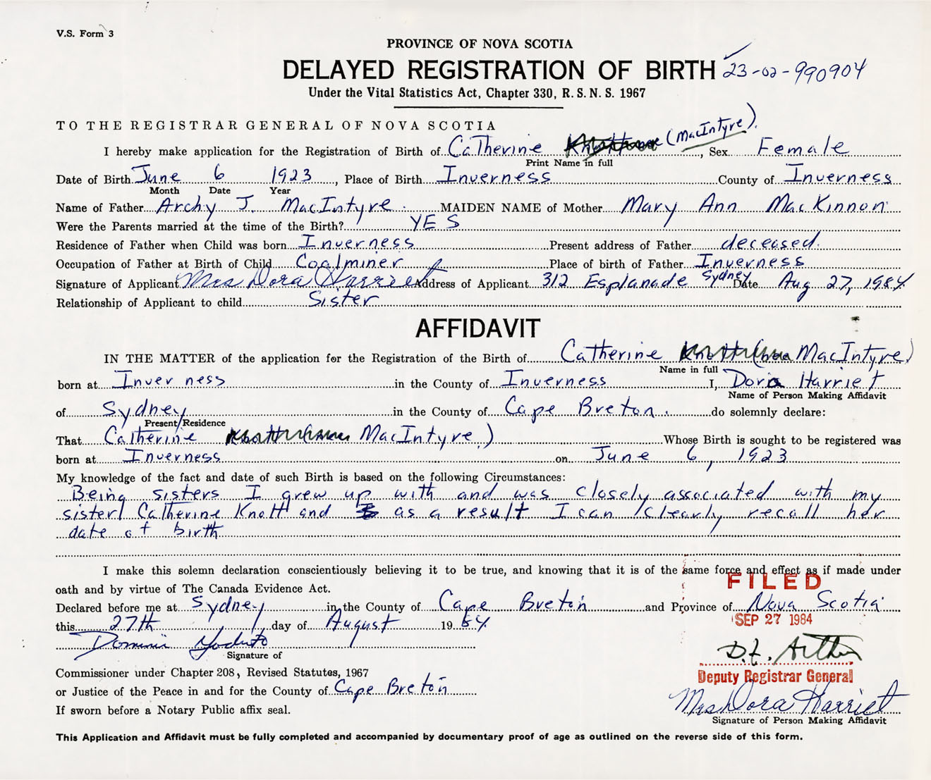 Signature of Applicant Mrs. Dora Harriet Address of Applicant 312 Esplanade, Sydney, Cape Breton Co., NS Date 27 August 1984