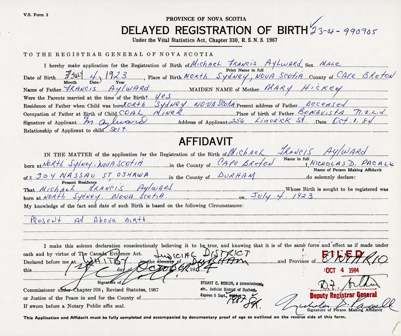 Date of Birth July 4, 1923 Place of Birth North SydneyCounty of Cape Breton