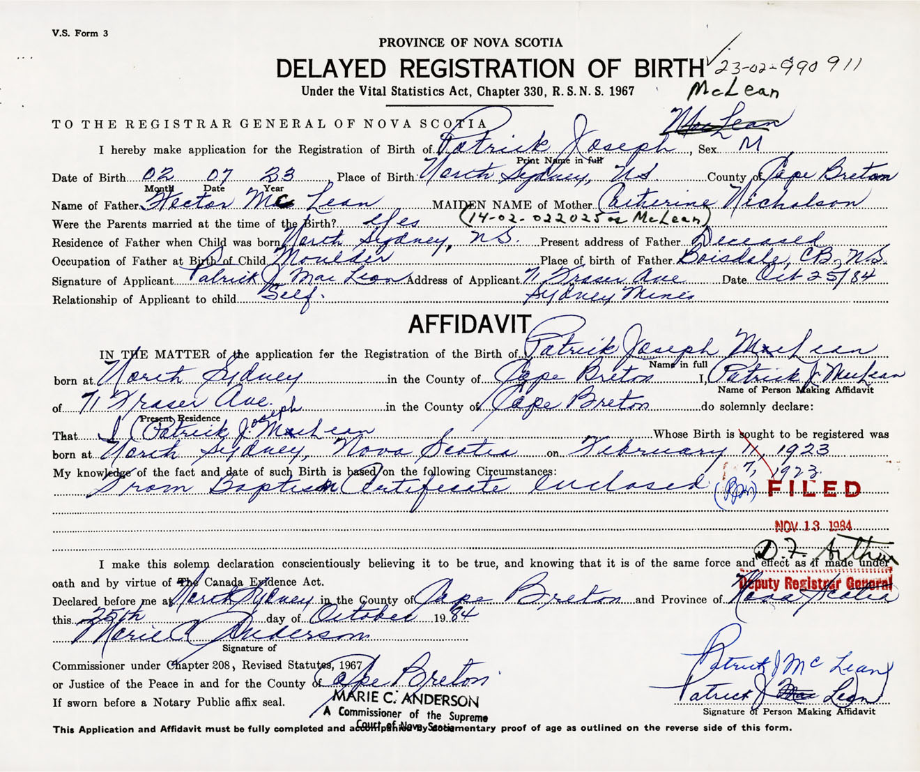 I hereby make application for the Registration of Birth of Patrick JosephMcLean Sex Male