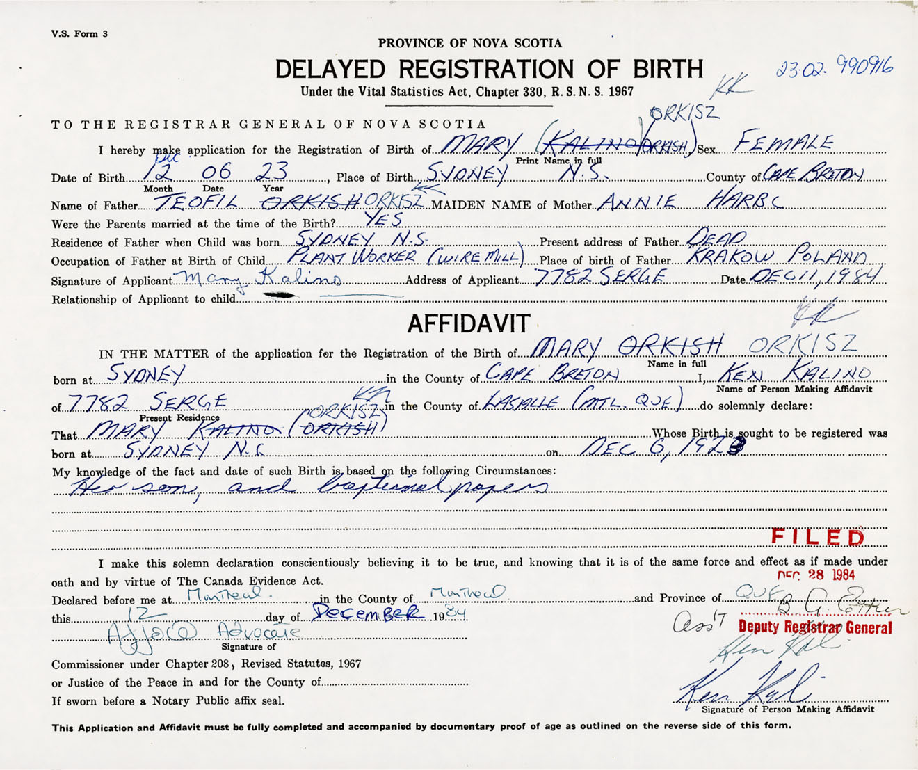 I hereby make application for the Registration of Birth of MaryOrkisz Sex Female