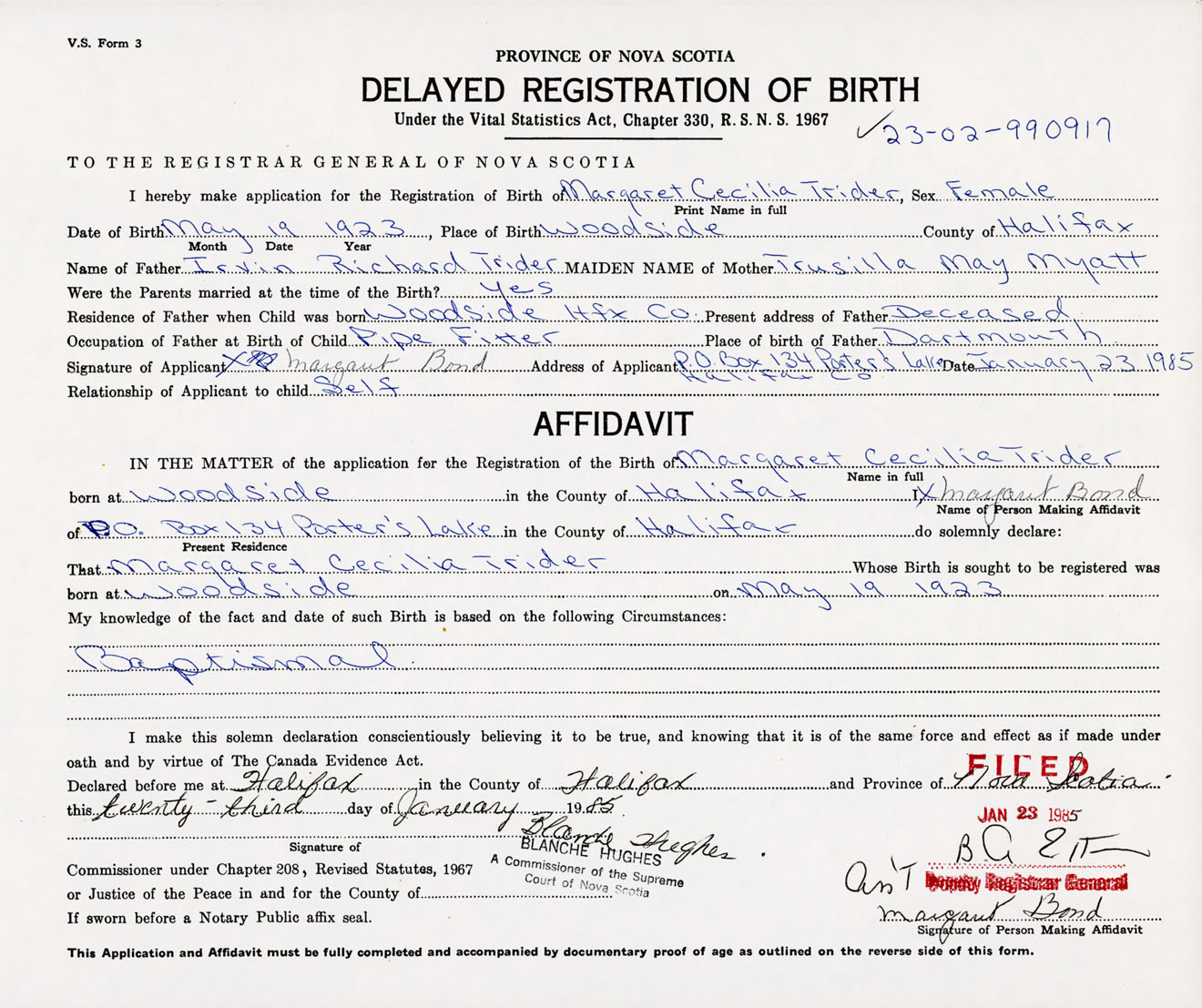 Signature of Applicant Margaret Bond Address of Applicant PO Box 134, Porters Lake, Halifax Co., NS Date 23 January 1985
