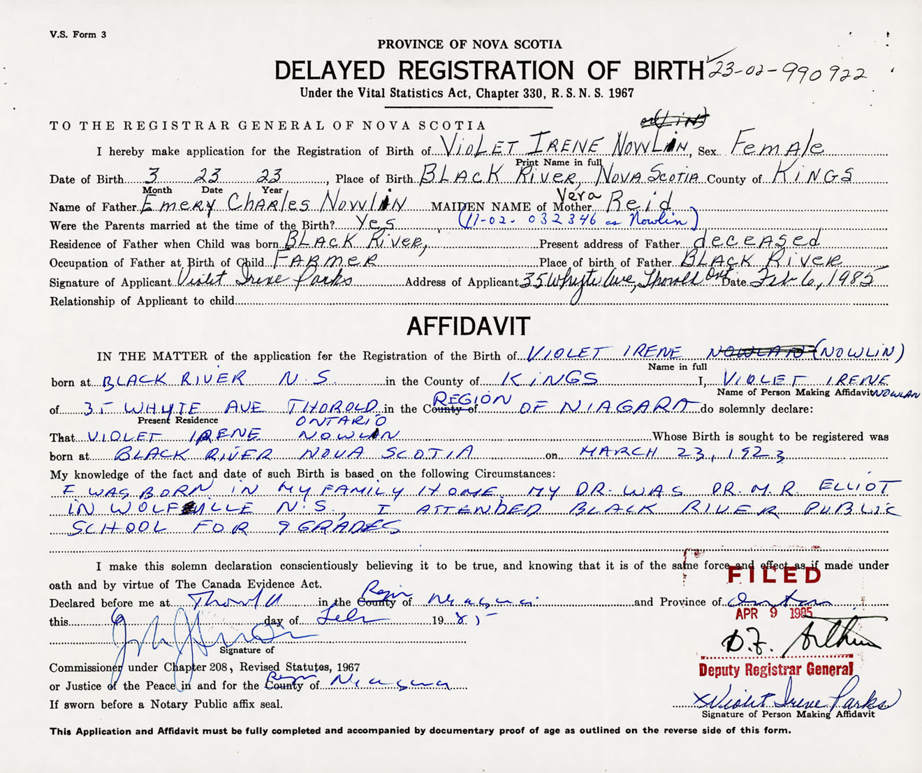 Signature of Applicant Violet Irene Parks Address of Applicant 35 Whyte Avenue, Thorold, Ontario Date 6 February 1985