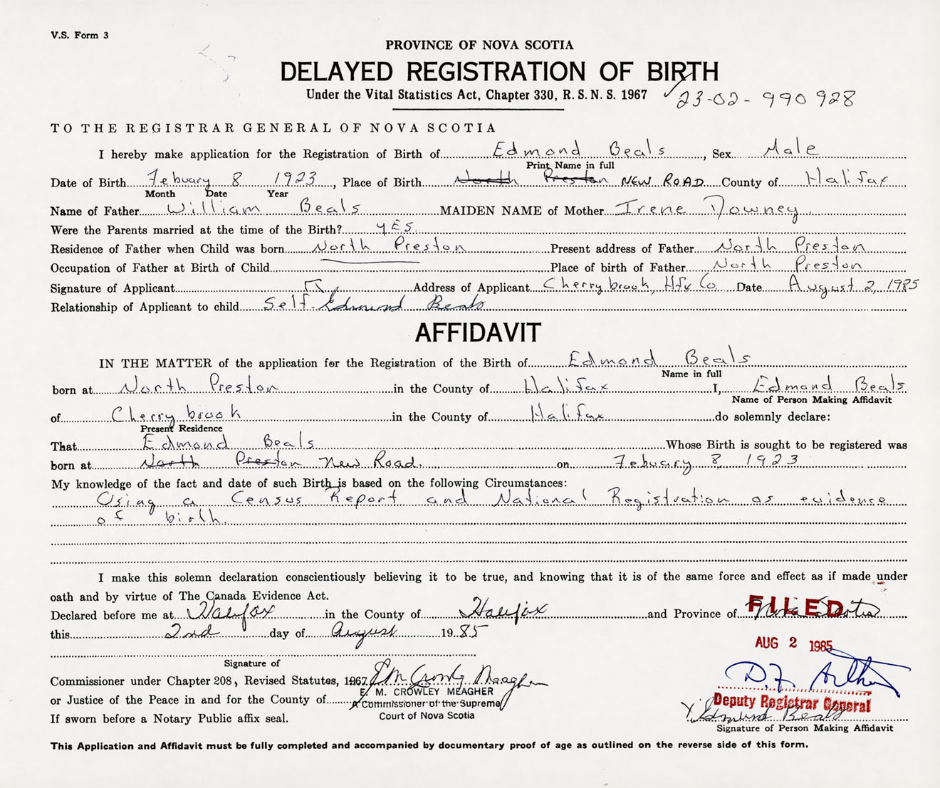 Signature of Applicant Edmond Beals Address of Applicant Cherrybrook, Halifax Co., NS Date 2 August 1985