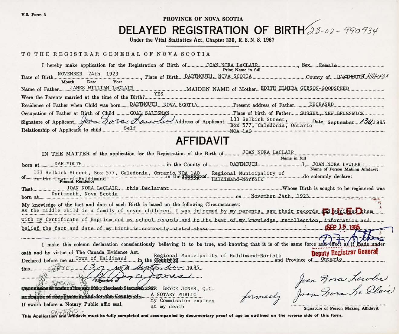 IN THE MATTER of the application for the Registration of the Birth of Joan NoraLeClair